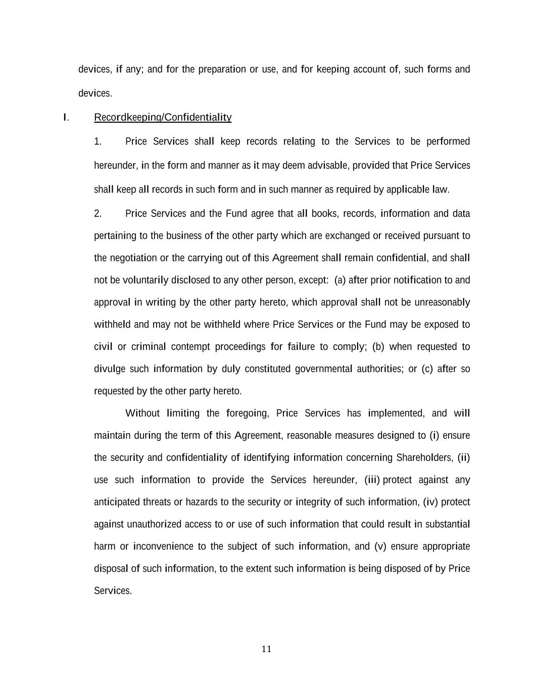 11 devices, if any; and for the preparation or use, and for keeping account of, such forms and devices. I. Recordkeeping/Confidentiality 1. Price Services shall keep records relating to the Services to be performed hereunder, in the form and manner as it may deem advisable, provided that Price Services shall keep all records in such form and in such manner as required by applicable law. 2. Price Services and the Fund agree that all books, records, information and data pertaining to the business of the other party which are exchanged or received pursuant to the negotiation or the carrying out of this Agreement shall remain confidential, and shall not be voluntarily disclosed to any other person, except: (a) after prior notification to and approval in writing by the other party hereto, which approval shall not be unreasonably withheld and may not be withheld where Price Services or the Fund may be exposed to civil or criminal contempt proceedings for failure to comply; (b) when requested to divulge such information by duly constituted governmental authorities; or (c) after so requested by the other party hereto. Without limiting the foregoing, Price Services has implemented, and will maintain during the term of this Agreement, reasonable measures designed to (i) ensure the security and confidentiality of identifying information concerning Shareholders, (ii) use such information to provide the Services hereunder, (iii) protect against any anticipated threats or hazards to the security or integrity of such information, (iv) protect against unauthorized access to or use of such information that could result in substantial harm or inconvenience to the subject of such information, and (v) ensure appropriate disposal of such information, to the extent such information is being disposed of by Price Services.
