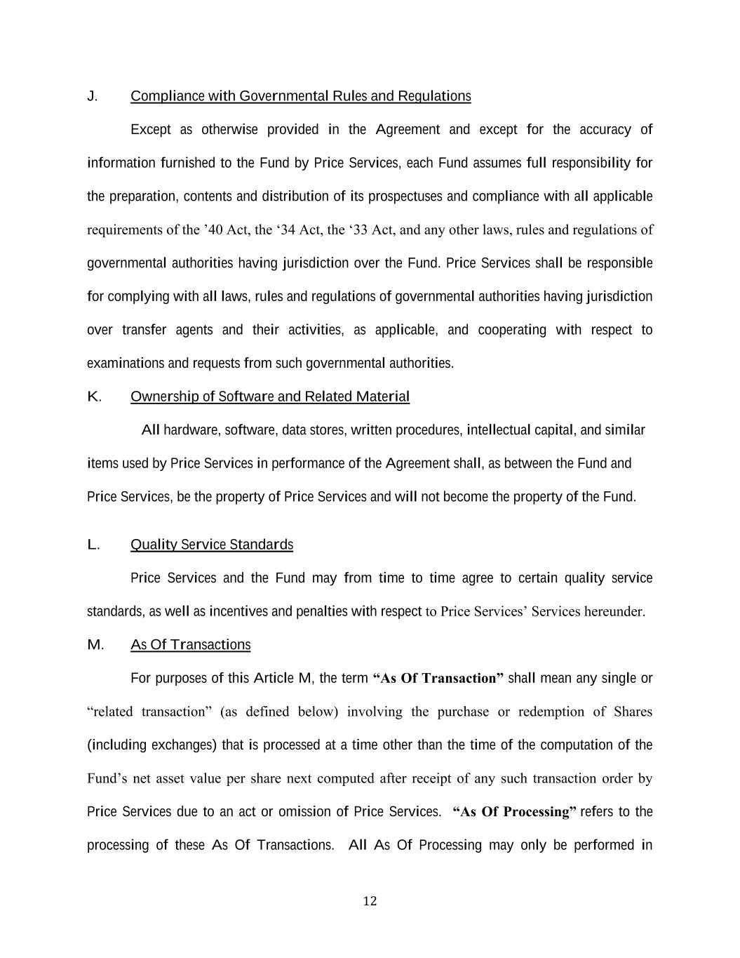 12 J. Compliance with Governmental Rules and Regulations Except as otherwise provided in the Agreement and except for the accuracy of information furnished to the Fund by Price Services, each Fund assumes full responsibility for the preparation, contents and distribution of its prospectuses and compliance with all applicable requirements of the ’40 Act, the ‘34 Act, the ‘33 Act, and any other laws, rules and regulations of governmental authorities having jurisdiction over the Fund. Price Services shall be responsible for complying with all laws, rules and regulations of governmental authorities having jurisdiction over transfer agents and their activities, as applicable, and cooperating with respect to examinations and requests from such governmental authorities. K. Ownership of Software and Related Material All hardware, software, data stores, written procedures, intellectual capital, and similar items used by Price Services in performance of the Agreement shall, as between the Fund and Price Services, be the property of Price Services and will not become the property of the Fund. L. Quality Service Standards Price Services and the Fund may from time to time agree to certain quality service standards, as well as incentives and penalties with respect to Price Services’ Services hereunder. M. As Of Transactions For purposes of this Article M, the term “As Of Transaction” shall mean any single or “related transaction” (as defined below) involving the purchase or redemption of Shares (including exchanges) that is processed at a time other than the time of the computation of the Fund’s net asset value per share next computed after receipt of any such transaction order by Price Services due to an act or omission of Price Services. “As Of Processing” refers to the processing of these As Of Transactions. All As Of Processing may only be performed in