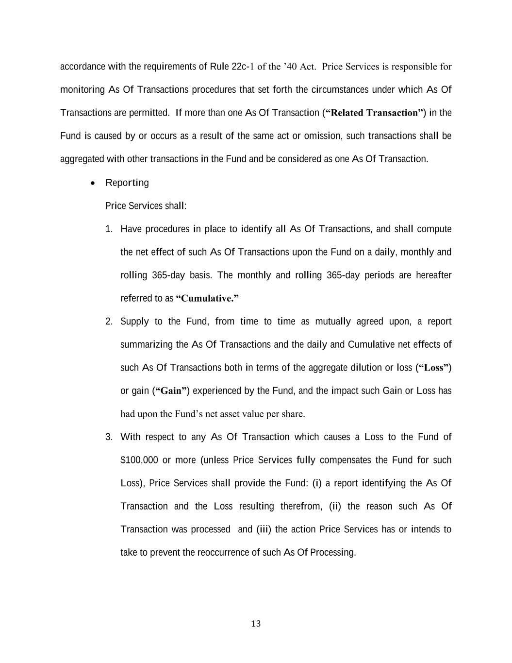 13 accordance with the requirements of Rule 22c-1 of the ’40 Act. Price Services is responsible for monitoring As Of Transactions procedures that set forth the circumstances under which As Of Transactions are permitted. If more than one As Of Transaction (“Related Transaction”) in the Fund is caused by or occurs as a result of the same act or omission, such transactions shall be aggregated with other transactions in the Fund and be considered as one As Of Transaction. • Reporting Price Services shall: 1. Have procedures in place to identify all As Of Transactions, and shall compute the net effect of such As Of Transactions upon the Fund on a daily, monthly and rolling 365-day basis. The monthly and rolling 365-day periods are hereafter referred to as “Cumulative.” 2. Supply to the Fund, from time to time as mutually agreed upon, a report summarizing the As Of Transactions and the daily and Cumulative net effects of such As Of Transactions both in terms of the aggregate dilution or loss (“Loss”) or gain (“Gain”) experienced by the Fund, and the impact such Gain or Loss has had upon the Fund’s net asset value per share. 3. With respect to any As Of Transaction which causes a Loss to the Fund of $100,000 or more (unless Price Services fully compensates the Fund for such Loss), Price Services shall provide the Fund: (i) a report identifying the As Of Transaction and the Loss resulting therefrom, (ii) the reason such As Of Transaction was processed and (iii) the action Price Services has or intends to take to prevent the reoccurrence of such As Of Processing.