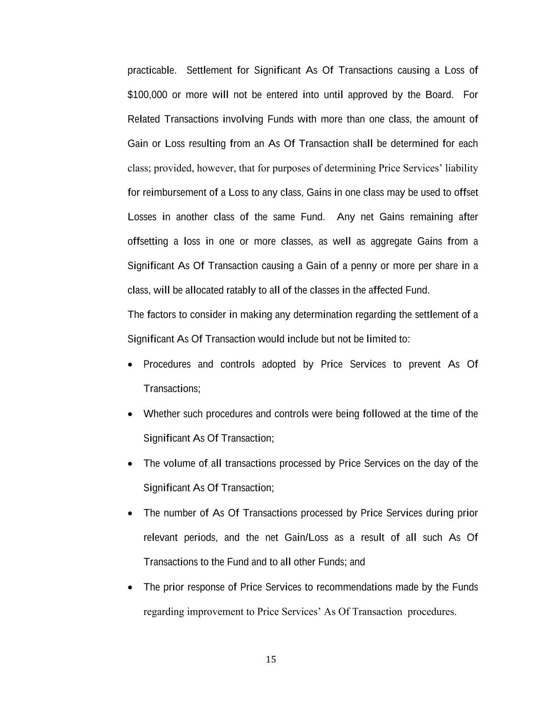 15 practicable. Settlement for Significant As Of Transactions causing a Loss of $100,000 or more will not be entered into until approved by the Board. For Related Transactions involving Funds with more than one class, the amount of Gain or Loss resulting from an As Of Transaction shall be determined for each class; provided, however, that for purposes of determining Price Services’ liability for reimbursement of a Loss to any class, Gains in one class may be used to offset Losses in another class of the same Fund. Any net Gains remaining after offsetting a loss in one or more classes, as well as aggregate Gains from a Significant As Of Transaction causing a Gain of a penny or more per share in a class, will be allocated ratably to all of the classes in the affected Fund. The factors to consider in making any determination regarding the settlement of a Significant As Of Transaction would include but not be limited to: • Procedures and controls adopted by Price Services to prevent As Of Transactions; • Whether such procedures and controls were being followed at the time of the Significant As Of Transaction; • The volume of all transactions processed by Price Services on the day of the Significant As Of Transaction; • The number of As Of Transactions processed by Price Services during prior relevant periods, and the net Gain/Loss as a result of all such As Of Transactions to the Fund and to all other Funds; and • The prior response of Price Services to recommendations made by the Funds regarding improvement to Price Services’ As Of Transaction procedures.