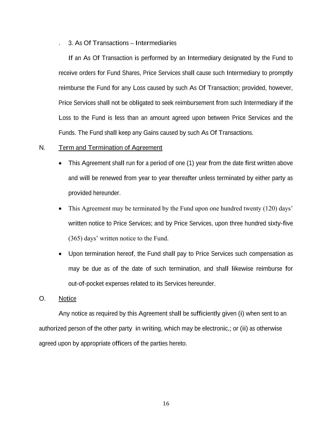 16 . 3. As Of Transactions – Intermediaries If an As Of Transaction is performed by an Intermediary designated by the Fund to receive orders for Fund Shares, Price Services shall cause such Intermediary to promptly reimburse the Fund for any Loss caused by such As Of Transaction; provided, however, Price Services shall not be obligated to seek reimbursement from such Intermediary if the Loss to the Fund is less than an amount agreed upon between Price Services and the Funds. The Fund shall keep any Gains caused by such As Of Transactions. N. Term and Termination of Agreement • This Agreement shall run for a period of one (1) year from the date first written above and will be renewed from year to year thereafter unless terminated by either party as provided hereunder. • This Agreement may be terminated by the Fund upon one hundred twenty (120) days’ written notice to Price Services; and by Price Services, upon three hundred sixty-five (365) days’ written notice to the Fund. • Upon termination hereof, the Fund shall pay to Price Services such compensation as may be due as of the date of such termination, and shall likewise reimburse for out-of-pocket expenses related to its Services hereunder. O. Notice Any notice as required by this Agreement shall be sufficiently given (i) when sent to an authorized person of the other party in writing, which may be electronic,; or (ii) as otherwise agreed upon by appropriate officers of the parties hereto.