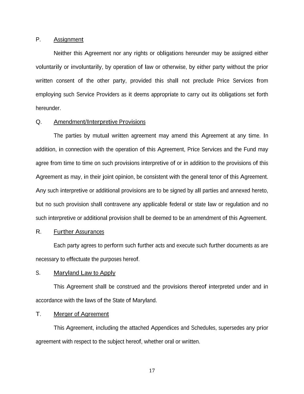 17 P. Assignment Neither this Agreement nor any rights or obligations hereunder may be assigned either voluntarily or involuntarily, by operation of law or otherwise, by either party without the prior written consent of the other party, provided this shall not preclude Price Services from employing such Service Providers as it deems appropriate to carry out its obligations set forth hereunder. Q. Amendment/Interpretive Provisions The parties by mutual written agreement may amend this Agreement at any time. In addition, in connection with the operation of this Agreement, Price Services and the Fund may agree from time to time on such provisions interpretive of or in addition to the provisions of this Agreement as may, in their joint opinion, be consistent with the general tenor of this Agreement. Any such interpretive or additional provisions are to be signed by all parties and annexed hereto, but no such provision shall contravene any applicable federal or state law or regulation and no such interpretive or additional provision shall be deemed to be an amendment of this Agreement. R. Further Assurances Each party agrees to perform such further acts and execute such further documents as are necessary to effectuate the purposes hereof. S. Maryland Law to Apply This Agreement shall be construed and the provisions thereof interpreted under and in accordance with the laws of the State of Maryland. T. Merger of Agreement This Agreement, including the attached Appendices and Schedules, supersedes any prior agreement with respect to the subject hereof, whether oral or written.