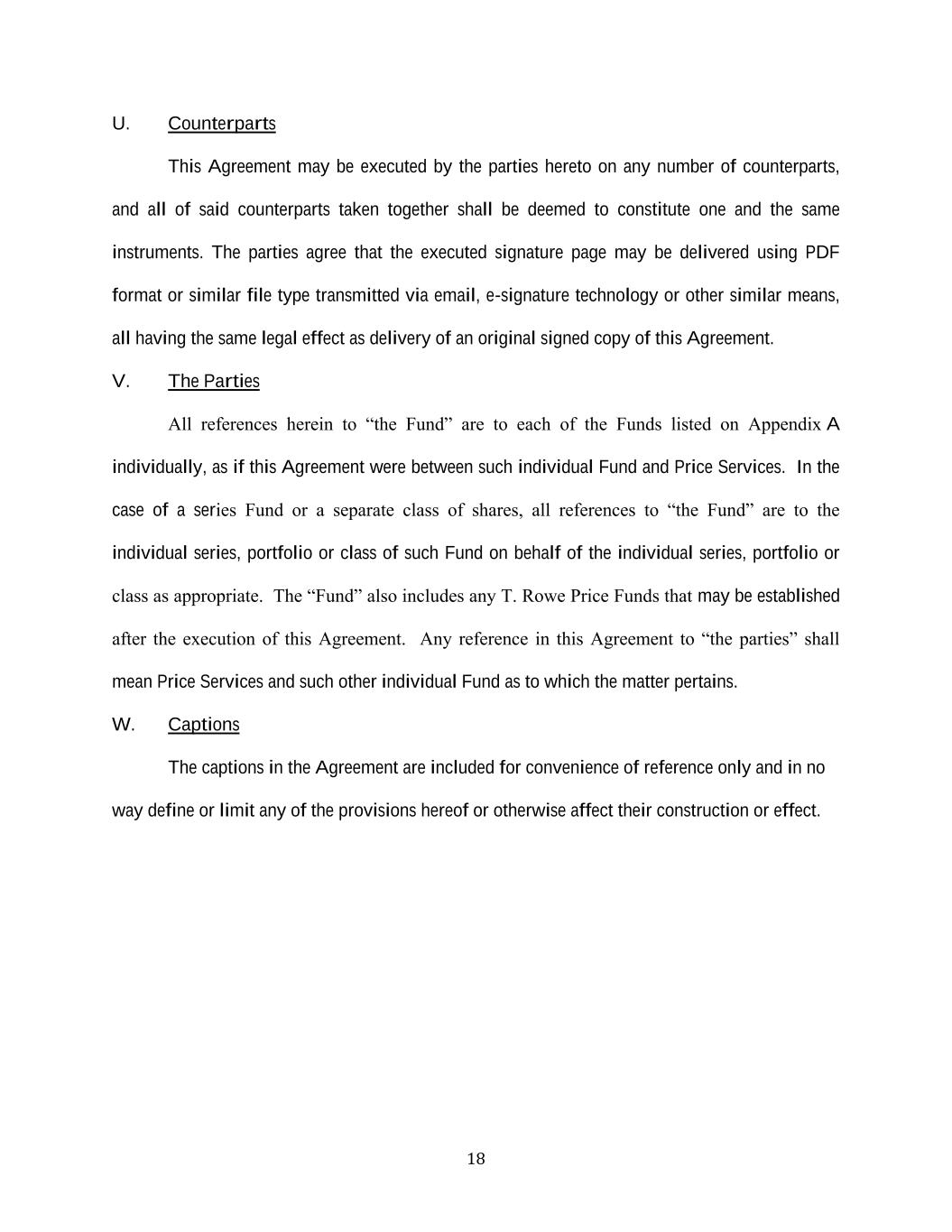 18 U. Counterparts This Agreement may be executed by the parties hereto on any number of counterparts, and all of said counterparts taken together shall be deemed to constitute one and the same instruments. The parties agree that the executed signature page may be delivered using PDF format or similar file type transmitted via email, e-signature technology or other similar means, all having the same legal effect as delivery of an original signed copy of this Agreement. V. The Parties All references herein to “the Fund” are to each of the Funds listed on Appendix A individually, as if this Agreement were between such individual Fund and Price Services. In the case of a series Fund or a separate class of shares, all references to “the Fund” are to the individual series, portfolio or class of such Fund on behalf of the individual series, portfolio or class as appropriate. The “Fund” also includes any T. Rowe Price Funds that may be established after the execution of this Agreement. Any reference in this Agreement to “the parties” shall mean Price Services and such other individual Fund as to which the matter pertains. W. Captions The captions in the Agreement are included for convenience of reference only and in no way define or limit any of the provisions hereof or otherwise affect their construction or effect.