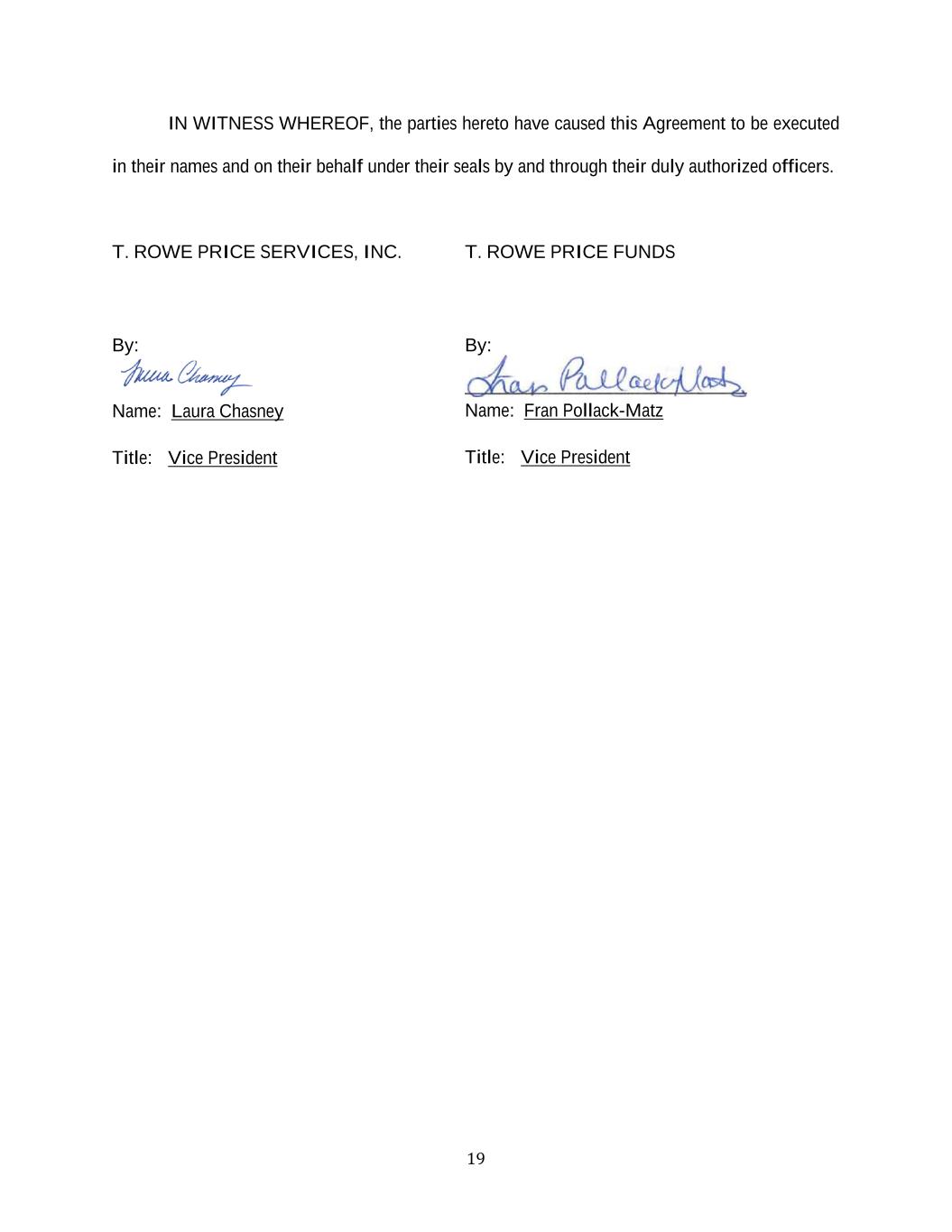 19 IN WITNESS WHEREOF, the parties hereto have caused this Agreement to be executed in their names and on their behalf under their seals by and through their duly authorized officers. T. ROWE PRICE SERVICES, INC. T. ROWE PRICE FUNDS By: Name: Laura Chasney Title: Vice President By: Name: Fran Pollack-Matz Title: Vice President