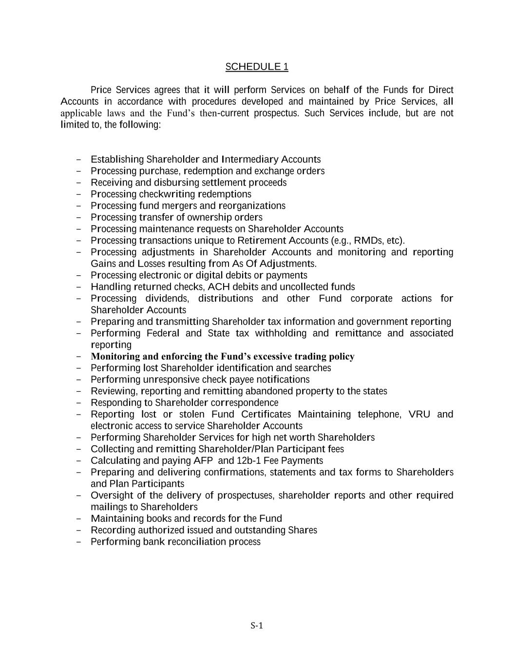 S-1 SCHEDULE 1 Price Services agrees that it will perform Services on behalf of the Funds for Direct Accounts in accordance with procedures developed and maintained by Price Services, all applicable laws and the Fund’s then-current prospectus. Such Services include, but are not limited to, the following: - Establishing Shareholder and Intermediary Accounts - Processing purchase, redemption and exchange orders - Receiving and disbursing settlement proceeds - Processing checkwriting redemptions - Processing fund mergers and reorganizations - Processing transfer of ownership orders - Processing maintenance requests on Shareholder Accounts - Processing transactions unique to Retirement Accounts (e.g., RMDs, etc). - Processing adjustments in Shareholder Accounts and monitoring and reporting Gains and Losses resulting from As Of Adjustments. - Processing electronic or digital debits or payments - Handling returned checks, ACH debits and uncollected funds - Processing dividends, distributions and other Fund corporate actions for Shareholder Accounts - Preparing and transmitting Shareholder tax information and government reporting - Performing Federal and State tax withholding and remittance and associated reporting - Monitoring and enforcing the Fund’s excessive trading policy - Performing lost Shareholder identification and searches - Performing unresponsive check payee notifications - Reviewing, reporting and remitting abandoned property to the states - Responding to Shareholder correspondence - Reporting lost or stolen Fund Certificates Maintaining telephone, VRU and electronic access to service Shareholder Accounts - Performing Shareholder Services for high net worth Shareholders - Collecting and remitting Shareholder/Plan Participant fees - Calculating and paying AFP and 12b-1 Fee Payments - Preparing and delivering confirmations, statements and tax forms to Shareholders and Plan Participants - Oversight of the delivery of prospectuses, shareholder reports and other required mailings to Shareholders - Maintaining books and records for the Fund - Recording authorized issued and outstanding Shares - Performing bank reconciliation process