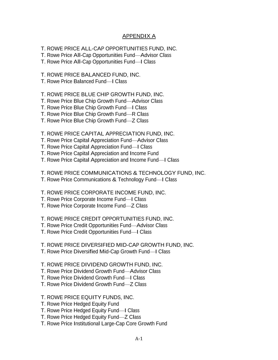 A-1 APPENDIX A T. ROWE PRICE ALL-CAP OPPORTUNITIES FUND, INC. T. Rowe Price All-Cap Opportunities Fund—Advisor Class T. Rowe Price All-Cap Opportunities Fund—I Class T. ROWE PRICE BALANCED FUND, INC. T. Rowe Price Balanced Fund—I Class T. ROWE PRICE BLUE CHIP GROWTH FUND, INC. T. Rowe Price Blue Chip Growth Fund—Advisor Class T. Rowe Price Blue Chip Growth Fund—I Class T. Rowe Price Blue Chip Growth Fund—R Class T. Rowe Price Blue Chip Growth Fund—Z Class T. ROWE PRICE CAPITAL APPRECIATION FUND, INC. T. Rowe Price Capital Appreciation Fund—Advisor Class T. Rowe Price Capital Appreciation Fund—I Class T. Rowe Price Capital Appreciation and Income Fund T. Rowe Price Capital Appreciation and Income Fund—I Class T. ROWE PRICE COMMUNICATIONS & TECHNOLOGY FUND, INC. T. Rowe Price Communications & Technology Fund—I Class T. ROWE PRICE CORPORATE INCOME FUND, INC. T. Rowe Price Corporate Income Fund—I Class T. Rowe Price Corporate Income Fund—Z Class T. ROWE PRICE CREDIT OPPORTUNITIES FUND, INC. T. Rowe Price Credit Opportunities Fund—Advisor Class T. Rowe Price Credit Opportunities Fund—I Class T. ROWE PRICE DIVERSIFIED MID-CAP GROWTH FUND, INC. T. Rowe Price Diversified Mid-Cap Growth Fund—I Class T. ROWE PRICE DIVIDEND GROWTH FUND, INC. T. Rowe Price Dividend Growth Fund—Advisor Class T. Rowe Price Dividend Growth Fund—I Class T. Rowe Price Dividend Growth Fund—Z Class T. ROWE PRICE EQUITY FUNDS, INC. T. Rowe Price Hedged Equity Fund T. Rowe Price Hedged Equity Fund—I Class T. Rowe Price Hedged Equity Fund—Z Class T. Rowe Price Institutional Large-Cap Core Growth Fund