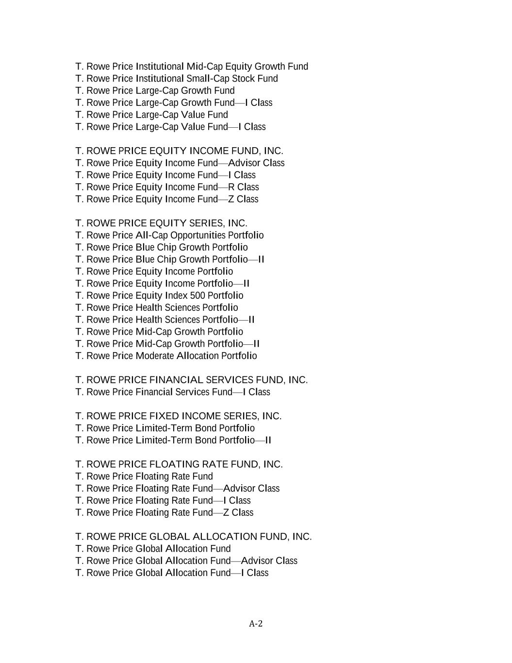 A-2 T. Rowe Price Institutional Mid-Cap Equity Growth Fund T. Rowe Price Institutional Small-Cap Stock Fund T. Rowe Price Large-Cap Growth Fund T. Rowe Price Large-Cap Growth Fund—I Class T. Rowe Price Large-Cap Value Fund T. Rowe Price Large-Cap Value Fund—I Class T. ROWE PRICE EQUITY INCOME FUND, INC. T. Rowe Price Equity Income Fund—Advisor Class T. Rowe Price Equity Income Fund—I Class T. Rowe Price Equity Income Fund—R Class T. Rowe Price Equity Income Fund—Z Class T. ROWE PRICE EQUITY SERIES, INC. T. Rowe Price All-Cap Opportunities Portfolio T. Rowe Price Blue Chip Growth Portfolio T. Rowe Price Blue Chip Growth Portfolio—II T. Rowe Price Equity Income Portfolio T. Rowe Price Equity Income Portfolio—II T. Rowe Price Equity Index 500 Portfolio T. Rowe Price Health Sciences Portfolio T. Rowe Price Health Sciences Portfolio—II T. Rowe Price Mid-Cap Growth Portfolio T. Rowe Price Mid-Cap Growth Portfolio—II T. Rowe Price Moderate Allocation Portfolio T. ROWE PRICE FINANCIAL SERVICES FUND, INC. T. Rowe Price Financial Services Fund—I Class T. ROWE PRICE FIXED INCOME SERIES, INC. T. Rowe Price Limited-Term Bond Portfolio T. Rowe Price Limited-Term Bond Portfolio—II T. ROWE PRICE FLOATING RATE FUND, INC. T. Rowe Price Floating Rate Fund T. Rowe Price Floating Rate Fund—Advisor Class T. Rowe Price Floating Rate Fund—I Class T. Rowe Price Floating Rate Fund—Z Class T. ROWE PRICE GLOBAL ALLOCATION FUND, INC. T. Rowe Price Global Allocation Fund T. Rowe Price Global Allocation Fund—Advisor Class T. Rowe Price Global Allocation Fund—I Class