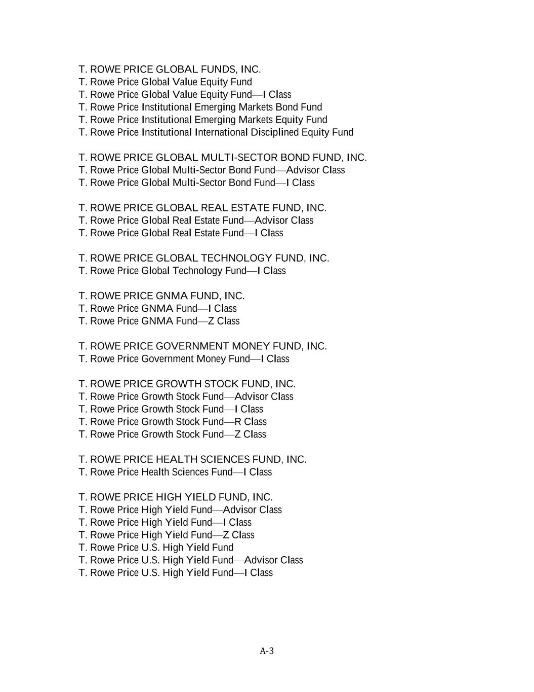 A-3 T. ROWE PRICE GLOBAL FUNDS, INC. T. Rowe Price Global Value Equity Fund T. Rowe Price Global Value Equity Fund—I Class T. Rowe Price Institutional Emerging Markets Bond Fund T. Rowe Price Institutional Emerging Markets Equity Fund T. Rowe Price Institutional International Disciplined Equity Fund T. ROWE PRICE GLOBAL MULTI-SECTOR BOND FUND, INC. T. Rowe Price Global Multi-Sector Bond Fund—Advisor Class T. Rowe Price Global Multi-Sector Bond Fund—I Class T. ROWE PRICE GLOBAL REAL ESTATE FUND, INC. T. Rowe Price Global Real Estate Fund—Advisor Class T. Rowe Price Global Real Estate Fund—I Class T. ROWE PRICE GLOBAL TECHNOLOGY FUND, INC. T. Rowe Price Global Technology Fund—I Class T. ROWE PRICE GNMA FUND, INC. T. Rowe Price GNMA Fund—I Class T. Rowe Price GNMA Fund—Z Class T. ROWE PRICE GOVERNMENT MONEY FUND, INC. T. Rowe Price Government Money Fund—I Class T. ROWE PRICE GROWTH STOCK FUND, INC. T. Rowe Price Growth Stock Fund—Advisor Class T. Rowe Price Growth Stock Fund—I Class T. Rowe Price Growth Stock Fund—R Class T. Rowe Price Growth Stock Fund—Z Class T. ROWE PRICE HEALTH SCIENCES FUND, INC. T. Rowe Price Health Sciences Fund—I Class T. ROWE PRICE HIGH YIELD FUND, INC. T. Rowe Price High Yield Fund—Advisor Class T. Rowe Price High Yield Fund—I Class T. Rowe Price High Yield Fund—Z Class T. Rowe Price U.S. High Yield Fund T. Rowe Price U.S. High Yield Fund—Advisor Class T. Rowe Price U.S. High Yield Fund—I Class