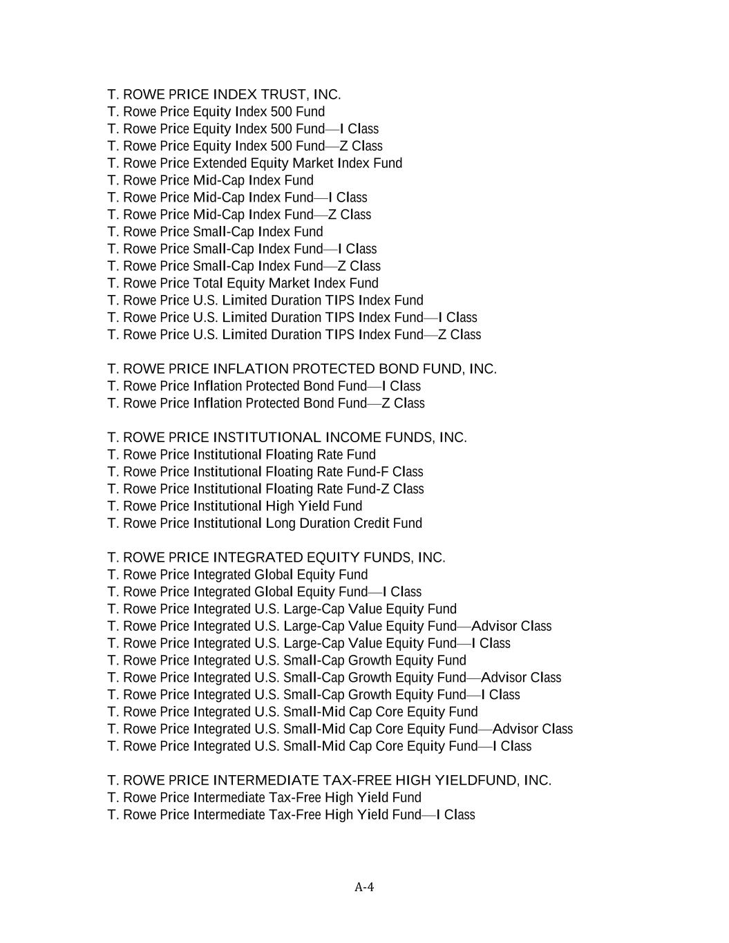 A-4 T. ROWE PRICE INDEX TRUST, INC. T. Rowe Price Equity Index 500 Fund T. Rowe Price Equity Index 500 Fund—I Class T. Rowe Price Equity Index 500 Fund—Z Class T. Rowe Price Extended Equity Market Index Fund T. Rowe Price Mid-Cap Index Fund T. Rowe Price Mid-Cap Index Fund—I Class T. Rowe Price Mid-Cap Index Fund—Z Class T. Rowe Price Small-Cap Index Fund T. Rowe Price Small-Cap Index Fund—I Class T. Rowe Price Small-Cap Index Fund—Z Class T. Rowe Price Total Equity Market Index Fund T. Rowe Price U.S. Limited Duration TIPS Index Fund T. Rowe Price U.S. Limited Duration TIPS Index Fund—I Class T. Rowe Price U.S. Limited Duration TIPS Index Fund—Z Class T. ROWE PRICE INFLATION PROTECTED BOND FUND, INC. T. Rowe Price Inflation Protected Bond Fund—I Class T. Rowe Price Inflation Protected Bond Fund—Z Class T. ROWE PRICE INSTITUTIONAL INCOME FUNDS, INC. T. Rowe Price Institutional Floating Rate Fund T. Rowe Price Institutional Floating Rate Fund-F Class T. Rowe Price Institutional Floating Rate Fund-Z Class T. Rowe Price Institutional High Yield Fund T. Rowe Price Institutional Long Duration Credit Fund T. ROWE PRICE INTEGRATED EQUITY FUNDS, INC. T. Rowe Price Integrated Global Equity Fund T. Rowe Price Integrated Global Equity Fund—I Class T. Rowe Price Integrated U.S. Large-Cap Value Equity Fund T. Rowe Price Integrated U.S. Large-Cap Value Equity Fund—Advisor Class T. Rowe Price Integrated U.S. Large-Cap Value Equity Fund—I Class T. Rowe Price Integrated U.S. Small-Cap Growth Equity Fund T. Rowe Price Integrated U.S. Small-Cap Growth Equity Fund—Advisor Class T. Rowe Price Integrated U.S. Small-Cap Growth Equity Fund—I Class T. Rowe Price Integrated U.S. Small-Mid Cap Core Equity Fund T. Rowe Price Integrated U.S. Small-Mid Cap Core Equity Fund—Advisor Class T. Rowe Price Integrated U.S. Small-Mid Cap Core Equity Fund—I Class T. ROWE PRICE INTERMEDIATE TAX-FREE HIGH YIELDFUND, INC. T. Rowe Price Intermediate Tax-Free High Yield Fund T. Rowe Price Intermediate Tax-Free High Yield Fund—I Class