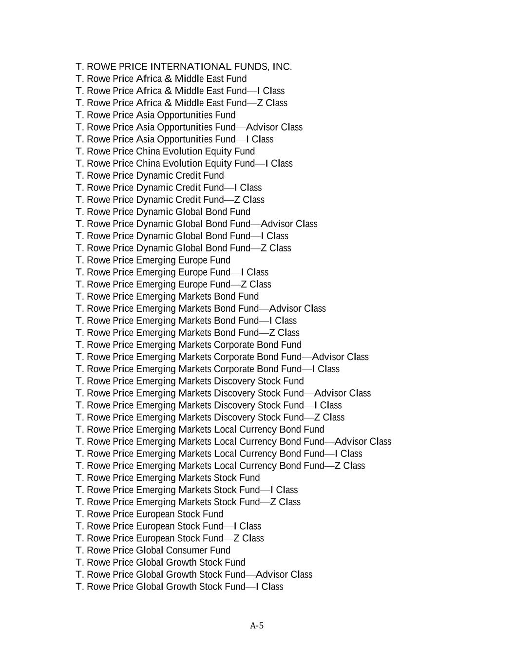 A-5 T. ROWE PRICE INTERNATIONAL FUNDS, INC. T. Rowe Price Africa & Middle East Fund T. Rowe Price Africa & Middle East Fund—I Class T. Rowe Price Africa & Middle East Fund—Z Class T. Rowe Price Asia Opportunities Fund T. Rowe Price Asia Opportunities Fund—Advisor Class T. Rowe Price Asia Opportunities Fund—I Class T. Rowe Price China Evolution Equity Fund T. Rowe Price China Evolution Equity Fund—I Class T. Rowe Price Dynamic Credit Fund T. Rowe Price Dynamic Credit Fund—I Class T. Rowe Price Dynamic Credit Fund—Z Class T. Rowe Price Dynamic Global Bond Fund T. Rowe Price Dynamic Global Bond Fund—Advisor Class T. Rowe Price Dynamic Global Bond Fund—I Class T. Rowe Price Dynamic Global Bond Fund—Z Class T. Rowe Price Emerging Europe Fund T. Rowe Price Emerging Europe Fund—I Class T. Rowe Price Emerging Europe Fund—Z Class T. Rowe Price Emerging Markets Bond Fund T. Rowe Price Emerging Markets Bond Fund—Advisor Class T. Rowe Price Emerging Markets Bond Fund—I Class T. Rowe Price Emerging Markets Bond Fund—Z Class T. Rowe Price Emerging Markets Corporate Bond Fund T. Rowe Price Emerging Markets Corporate Bond Fund—Advisor Class T. Rowe Price Emerging Markets Corporate Bond Fund—I Class T. Rowe Price Emerging Markets Discovery Stock Fund T. Rowe Price Emerging Markets Discovery Stock Fund—Advisor Class T. Rowe Price Emerging Markets Discovery Stock Fund—I Class T. Rowe Price Emerging Markets Discovery Stock Fund—Z Class T. Rowe Price Emerging Markets Local Currency Bond Fund T. Rowe Price Emerging Markets Local Currency Bond Fund—Advisor Class T. Rowe Price Emerging Markets Local Currency Bond Fund—I Class T. Rowe Price Emerging Markets Local Currency Bond Fund—Z Class T. Rowe Price Emerging Markets Stock Fund T. Rowe Price Emerging Markets Stock Fund—I Class T. Rowe Price Emerging Markets Stock Fund—Z Class T. Rowe Price European Stock Fund T. Rowe Price European Stock Fund—I Class T. Rowe Price European Stock Fund—Z Class T. Rowe Price Global Consumer Fund T. Rowe Price Global Growth Stock Fund T. Rowe Price Global Growth Stock Fund—Advisor Class T. Rowe Price Global Growth Stock Fund—I Class