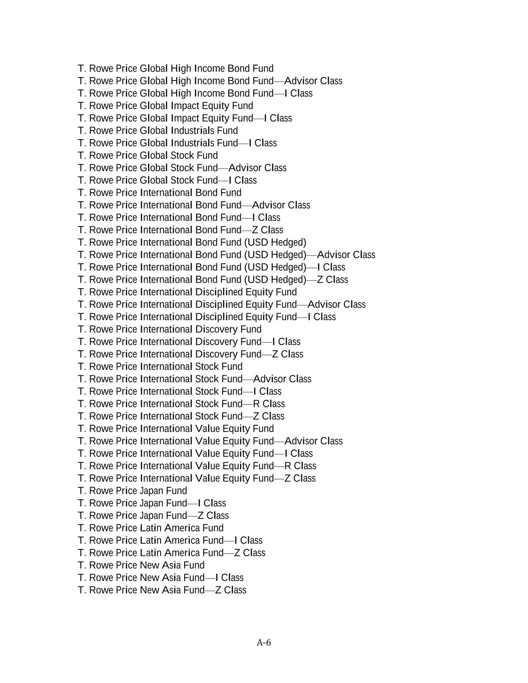 A-6 T. Rowe Price Global High Income Bond Fund T. Rowe Price Global High Income Bond Fund—Advisor Class T. Rowe Price Global High Income Bond Fund—I Class T. Rowe Price Global Impact Equity Fund T. Rowe Price Global Impact Equity Fund—I Class T. Rowe Price Global Industrials Fund T. Rowe Price Global Industrials Fund—I Class T. Rowe Price Global Stock Fund T. Rowe Price Global Stock Fund—Advisor Class T. Rowe Price Global Stock Fund—I Class T. Rowe Price International Bond Fund T. Rowe Price International Bond Fund—Advisor Class T. Rowe Price International Bond Fund—I Class T. Rowe Price International Bond Fund—Z Class T. Rowe Price International Bond Fund (USD Hedged) T. Rowe Price International Bond Fund (USD Hedged)—Advisor Class T. Rowe Price International Bond Fund (USD Hedged)—I Class T. Rowe Price International Bond Fund (USD Hedged)—Z Class T. Rowe Price International Disciplined Equity Fund T. Rowe Price International Disciplined Equity Fund—Advisor Class T. Rowe Price International Disciplined Equity Fund—I Class T. Rowe Price International Discovery Fund T. Rowe Price International Discovery Fund—I Class T. Rowe Price International Discovery Fund—Z Class T. Rowe Price International Stock Fund T. Rowe Price International Stock Fund—Advisor Class T. Rowe Price International Stock Fund—I Class T. Rowe Price International Stock Fund—R Class T. Rowe Price International Stock Fund—Z Class T. Rowe Price International Value Equity Fund T. Rowe Price International Value Equity Fund—Advisor Class T. Rowe Price International Value Equity Fund—I Class T. Rowe Price International Value Equity Fund—R Class T. Rowe Price International Value Equity Fund—Z Class T. Rowe Price Japan Fund T. Rowe Price Japan Fund—I Class T. Rowe Price Japan Fund—Z Class T. Rowe Price Latin America Fund T. Rowe Price Latin America Fund—I Class T. Rowe Price Latin America Fund—Z Class T. Rowe Price New Asia Fund T. Rowe Price New Asia Fund—I Class T. Rowe Price New Asia Fund—Z Class