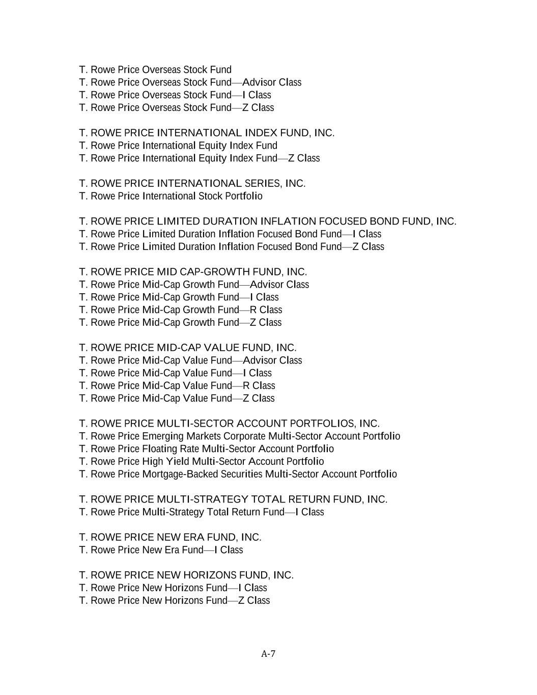 A-7 T. Rowe Price Overseas Stock Fund T. Rowe Price Overseas Stock Fund—Advisor Class T. Rowe Price Overseas Stock Fund—I Class T. Rowe Price Overseas Stock Fund—Z Class T. ROWE PRICE INTERNATIONAL INDEX FUND, INC. T. Rowe Price International Equity Index Fund T. Rowe Price International Equity Index Fund—Z Class T. ROWE PRICE INTERNATIONAL SERIES, INC. T. Rowe Price International Stock Portfolio T. ROWE PRICE LIMITED DURATION INFLATION FOCUSED BOND FUND, INC. T. Rowe Price Limited Duration Inflation Focused Bond Fund—I Class T. Rowe Price Limited Duration Inflation Focused Bond Fund—Z Class T. ROWE PRICE MID CAP-GROWTH FUND, INC. T. Rowe Price Mid-Cap Growth Fund—Advisor Class T. Rowe Price Mid-Cap Growth Fund—I Class T. Rowe Price Mid-Cap Growth Fund—R Class T. Rowe Price Mid-Cap Growth Fund—Z Class T. ROWE PRICE MID-CAP VALUE FUND, INC. T. Rowe Price Mid-Cap Value Fund—Advisor Class T. Rowe Price Mid-Cap Value Fund—I Class T. Rowe Price Mid-Cap Value Fund—R Class T. Rowe Price Mid-Cap Value Fund—Z Class T. ROWE PRICE MULTI-SECTOR ACCOUNT PORTFOLIOS, INC. T. Rowe Price Emerging Markets Corporate Multi-Sector Account Portfolio T. Rowe Price Floating Rate Multi-Sector Account Portfolio T. Rowe Price High Yield Multi-Sector Account Portfolio T. Rowe Price Mortgage-Backed Securities Multi-Sector Account Portfolio T. ROWE PRICE MULTI-STRATEGY TOTAL RETURN FUND, INC. T. Rowe Price Multi-Strategy Total Return Fund—I Class T. ROWE PRICE NEW ERA FUND, INC. T. Rowe Price New Era Fund—I Class T. ROWE PRICE NEW HORIZONS FUND, INC. T. Rowe Price New Horizons Fund—I Class T. Rowe Price New Horizons Fund—Z Class