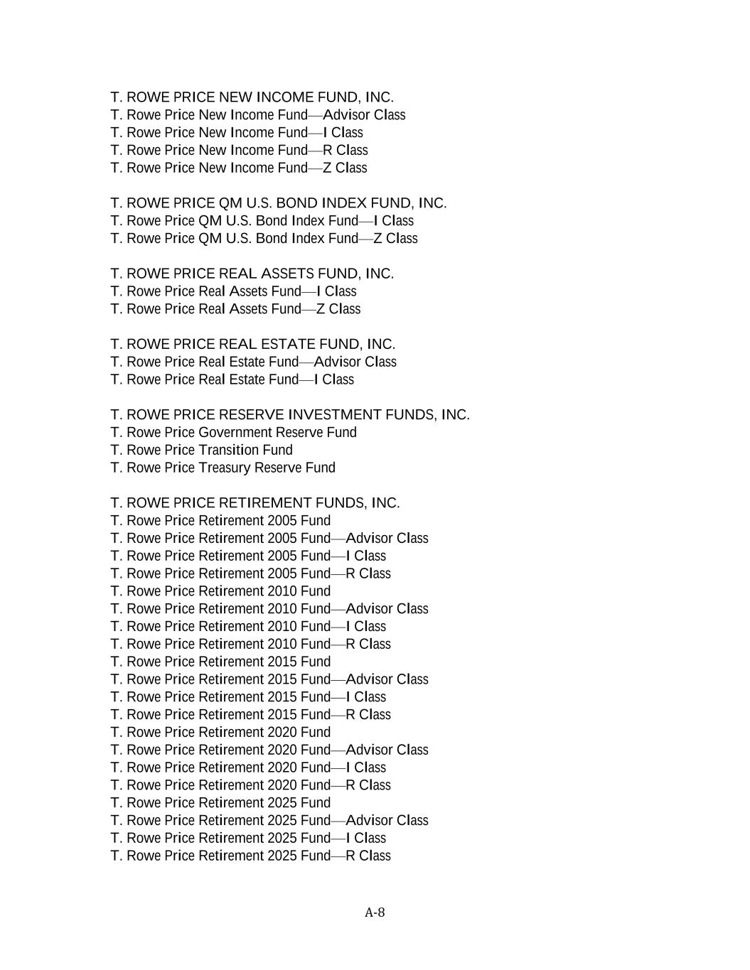 A-8 T. ROWE PRICE NEW INCOME FUND, INC. T. Rowe Price New Income Fund—Advisor Class T. Rowe Price New Income Fund—I Class T. Rowe Price New Income Fund—R Class T. Rowe Price New Income Fund—Z Class T. ROWE PRICE QM U.S. BOND INDEX FUND, INC. T. Rowe Price QM U.S. Bond Index Fund—I Class T. Rowe Price QM U.S. Bond Index Fund—Z Class T. ROWE PRICE REAL ASSETS FUND, INC. T. Rowe Price Real Assets Fund—I Class T. Rowe Price Real Assets Fund—Z Class T. ROWE PRICE REAL ESTATE FUND, INC. T. Rowe Price Real Estate Fund—Advisor Class T. Rowe Price Real Estate Fund—I Class T. ROWE PRICE RESERVE INVESTMENT FUNDS, INC. T. Rowe Price Government Reserve Fund T. Rowe Price Transition Fund T. Rowe Price Treasury Reserve Fund T. ROWE PRICE RETIREMENT FUNDS, INC. T. Rowe Price Retirement 2005 Fund T. Rowe Price Retirement 2005 Fund—Advisor Class T. Rowe Price Retirement 2005 Fund—I Class T. Rowe Price Retirement 2005 Fund—R Class T. Rowe Price Retirement 2010 Fund T. Rowe Price Retirement 2010 Fund—Advisor Class T. Rowe Price Retirement 2010 Fund—I Class T. Rowe Price Retirement 2010 Fund—R Class T. Rowe Price Retirement 2015 Fund T. Rowe Price Retirement 2015 Fund—Advisor Class T. Rowe Price Retirement 2015 Fund—I Class T. Rowe Price Retirement 2015 Fund—R Class T. Rowe Price Retirement 2020 Fund T. Rowe Price Retirement 2020 Fund—Advisor Class T. Rowe Price Retirement 2020 Fund—I Class T. Rowe Price Retirement 2020 Fund—R Class T. Rowe Price Retirement 2025 Fund T. Rowe Price Retirement 2025 Fund—Advisor Class T. Rowe Price Retirement 2025 Fund—I Class T. Rowe Price Retirement 2025 Fund—R Class