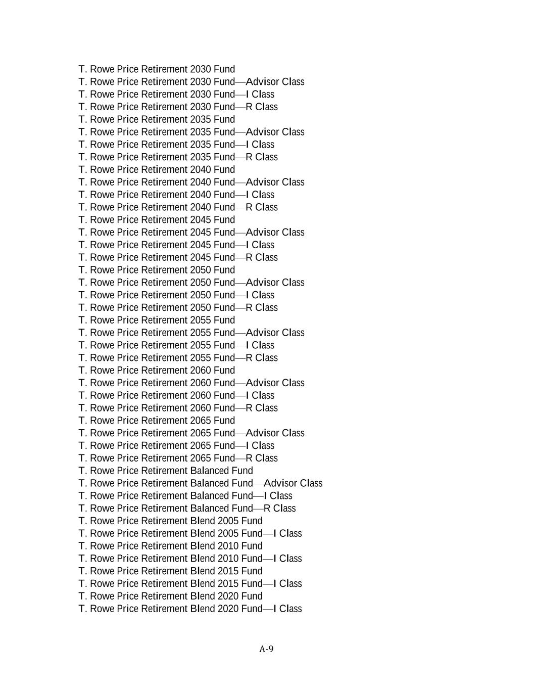 A-9 T. Rowe Price Retirement 2030 Fund T. Rowe Price Retirement 2030 Fund—Advisor Class T. Rowe Price Retirement 2030 Fund—I Class T. Rowe Price Retirement 2030 Fund—R Class T. Rowe Price Retirement 2035 Fund T. Rowe Price Retirement 2035 Fund—Advisor Class T. Rowe Price Retirement 2035 Fund—I Class T. Rowe Price Retirement 2035 Fund—R Class T. Rowe Price Retirement 2040 Fund T. Rowe Price Retirement 2040 Fund—Advisor Class T. Rowe Price Retirement 2040 Fund—I Class T. Rowe Price Retirement 2040 Fund—R Class T. Rowe Price Retirement 2045 Fund T. Rowe Price Retirement 2045 Fund—Advisor Class T. Rowe Price Retirement 2045 Fund—I Class T. Rowe Price Retirement 2045 Fund—R Class T. Rowe Price Retirement 2050 Fund T. Rowe Price Retirement 2050 Fund—Advisor Class T. Rowe Price Retirement 2050 Fund—I Class T. Rowe Price Retirement 2050 Fund—R Class T. Rowe Price Retirement 2055 Fund T. Rowe Price Retirement 2055 Fund—Advisor Class T. Rowe Price Retirement 2055 Fund—I Class T. Rowe Price Retirement 2055 Fund—R Class T. Rowe Price Retirement 2060 Fund T. Rowe Price Retirement 2060 Fund—Advisor Class T. Rowe Price Retirement 2060 Fund—I Class T. Rowe Price Retirement 2060 Fund—R Class T. Rowe Price Retirement 2065 Fund T. Rowe Price Retirement 2065 Fund—Advisor Class T. Rowe Price Retirement 2065 Fund—I Class T. Rowe Price Retirement 2065 Fund—R Class T. Rowe Price Retirement Balanced Fund T. Rowe Price Retirement Balanced Fund—Advisor Class T. Rowe Price Retirement Balanced Fund—I Class T. Rowe Price Retirement Balanced Fund—R Class T. Rowe Price Retirement Blend 2005 Fund T. Rowe Price Retirement Blend 2005 Fund—I Class T. Rowe Price Retirement Blend 2010 Fund T. Rowe Price Retirement Blend 2010 Fund—I Class T. Rowe Price Retirement Blend 2015 Fund T. Rowe Price Retirement Blend 2015 Fund—I Class T. Rowe Price Retirement Blend 2020 Fund T. Rowe Price Retirement Blend 2020 Fund—I Class