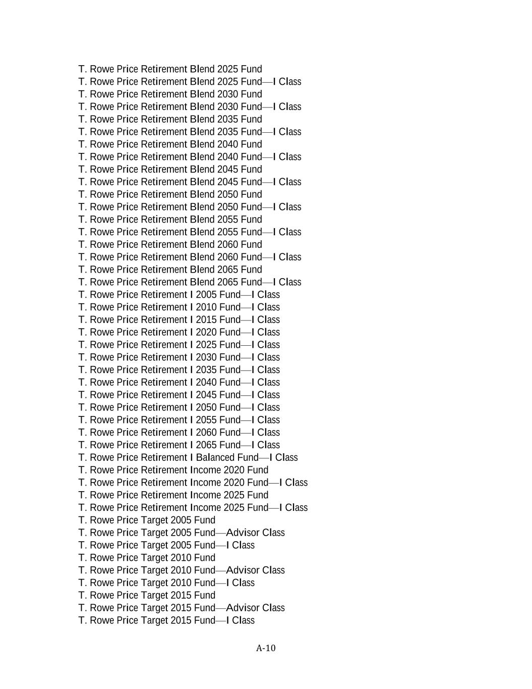 A-10 T. Rowe Price Retirement Blend 2025 Fund T. Rowe Price Retirement Blend 2025 Fund—I Class T. Rowe Price Retirement Blend 2030 Fund T. Rowe Price Retirement Blend 2030 Fund—I Class T. Rowe Price Retirement Blend 2035 Fund T. Rowe Price Retirement Blend 2035 Fund—I Class T. Rowe Price Retirement Blend 2040 Fund T. Rowe Price Retirement Blend 2040 Fund—I Class T. Rowe Price Retirement Blend 2045 Fund T. Rowe Price Retirement Blend 2045 Fund—I Class T. Rowe Price Retirement Blend 2050 Fund T. Rowe Price Retirement Blend 2050 Fund—I Class T. Rowe Price Retirement Blend 2055 Fund T. Rowe Price Retirement Blend 2055 Fund—I Class T. Rowe Price Retirement Blend 2060 Fund T. Rowe Price Retirement Blend 2060 Fund—I Class T. Rowe Price Retirement Blend 2065 Fund T. Rowe Price Retirement Blend 2065 Fund—I Class T. Rowe Price Retirement I 2005 Fund—I Class T. Rowe Price Retirement I 2010 Fund—I Class T. Rowe Price Retirement I 2015 Fund—I Class T. Rowe Price Retirement I 2020 Fund—I Class T. Rowe Price Retirement I 2025 Fund—I Class T. Rowe Price Retirement I 2030 Fund—I Class T. Rowe Price Retirement I 2035 Fund—I Class T. Rowe Price Retirement I 2040 Fund—I Class T. Rowe Price Retirement I 2045 Fund—I Class T. Rowe Price Retirement I 2050 Fund—I Class T. Rowe Price Retirement I 2055 Fund—I Class T. Rowe Price Retirement I 2060 Fund—I Class T. Rowe Price Retirement I 2065 Fund—I Class T. Rowe Price Retirement I Balanced Fund—I Class T. Rowe Price Retirement Income 2020 Fund T. Rowe Price Retirement Income 2020 Fund—I Class T. Rowe Price Retirement Income 2025 Fund T. Rowe Price Retirement Income 2025 Fund—I Class T. Rowe Price Target 2005 Fund T. Rowe Price Target 2005 Fund—Advisor Class T. Rowe Price Target 2005 Fund—I Class T. Rowe Price Target 2010 Fund T. Rowe Price Target 2010 Fund—Advisor Class T. Rowe Price Target 2010 Fund—I Class T. Rowe Price Target 2015 Fund T. Rowe Price Target 2015 Fund—Advisor Class T. Rowe Price Target 2015 Fund—I Class