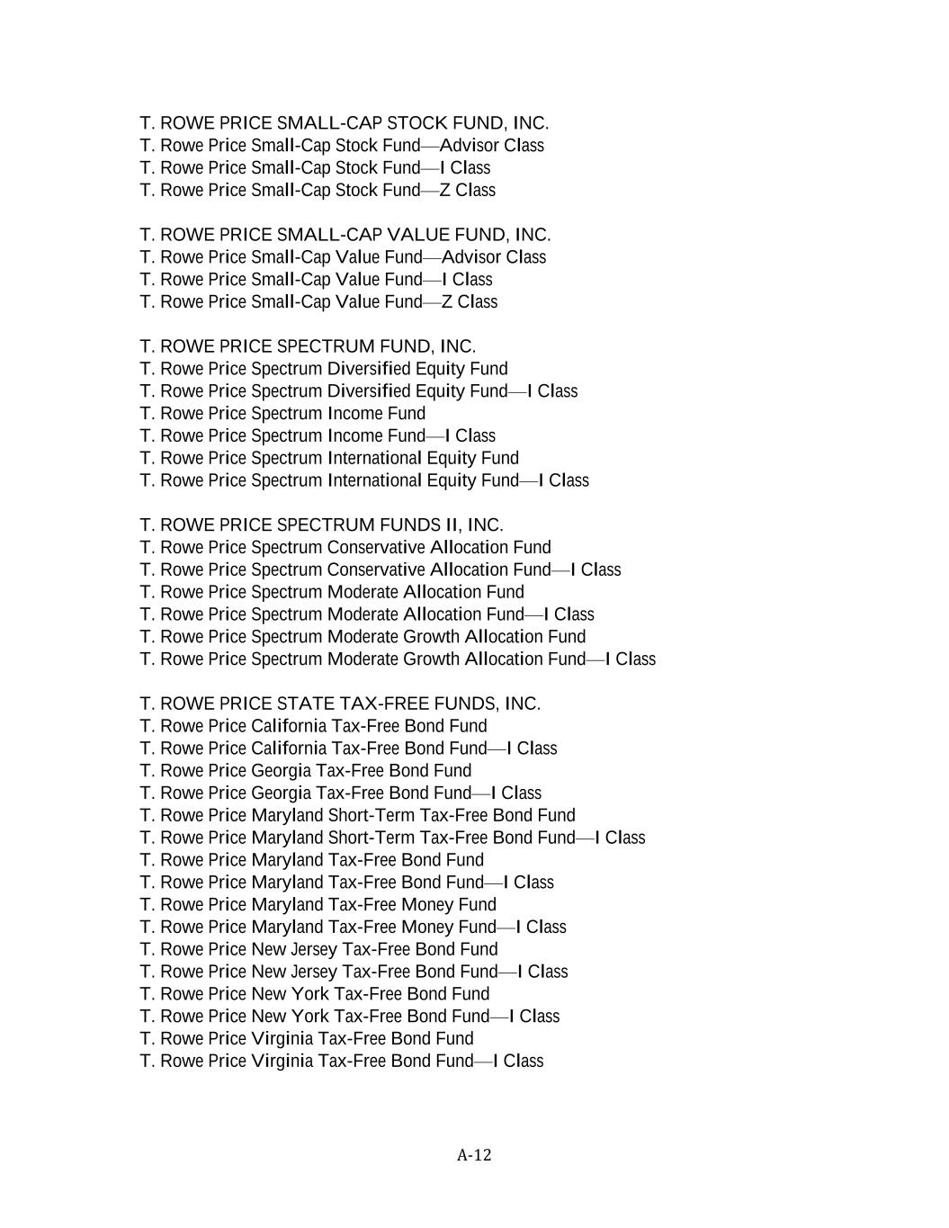 A-12 T. ROWE PRICE SMALL-CAP STOCK FUND, INC. T. Rowe Price Small-Cap Stock Fund—Advisor Class T. Rowe Price Small-Cap Stock Fund—I Class T. Rowe Price Small-Cap Stock Fund—Z Class T. ROWE PRICE SMALL-CAP VALUE FUND, INC. T. Rowe Price Small-Cap Value Fund—Advisor Class T. Rowe Price Small-Cap Value Fund—I Class T. Rowe Price Small-Cap Value Fund—Z Class T. ROWE PRICE SPECTRUM FUND, INC. T. Rowe Price Spectrum Diversified Equity Fund T. Rowe Price Spectrum Diversified Equity Fund—I Class T. Rowe Price Spectrum Income Fund T. Rowe Price Spectrum Income Fund—I Class T. Rowe Price Spectrum International Equity Fund T. Rowe Price Spectrum International Equity Fund—I Class T. ROWE PRICE SPECTRUM FUNDS II, INC. T. Rowe Price Spectrum Conservative Allocation Fund T. Rowe Price Spectrum Conservative Allocation Fund—I Class T. Rowe Price Spectrum Moderate Allocation Fund T. Rowe Price Spectrum Moderate Allocation Fund—I Class T. Rowe Price Spectrum Moderate Growth Allocation Fund T. Rowe Price Spectrum Moderate Growth Allocation Fund—I Class T. ROWE PRICE STATE TAX-FREE FUNDS, INC. T. Rowe Price California Tax-Free Bond Fund T. Rowe Price California Tax-Free Bond Fund—I Class T. Rowe Price Georgia Tax-Free Bond Fund T. Rowe Price Georgia Tax-Free Bond Fund—I Class T. Rowe Price Maryland Short-Term Tax-Free Bond Fund T. Rowe Price Maryland Short-Term Tax-Free Bond Fund—I Class T. Rowe Price Maryland Tax-Free Bond Fund T. Rowe Price Maryland Tax-Free Bond Fund—I Class T. Rowe Price Maryland Tax-Free Money Fund T. Rowe Price Maryland Tax-Free Money Fund—I Class T. Rowe Price New Jersey Tax-Free Bond Fund T. Rowe Price New Jersey Tax-Free Bond Fund—I Class T. Rowe Price New York Tax-Free Bond Fund T. Rowe Price New York Tax-Free Bond Fund—I Class T. Rowe Price Virginia Tax-Free Bond Fund T. Rowe Price Virginia Tax-Free Bond Fund—I Class