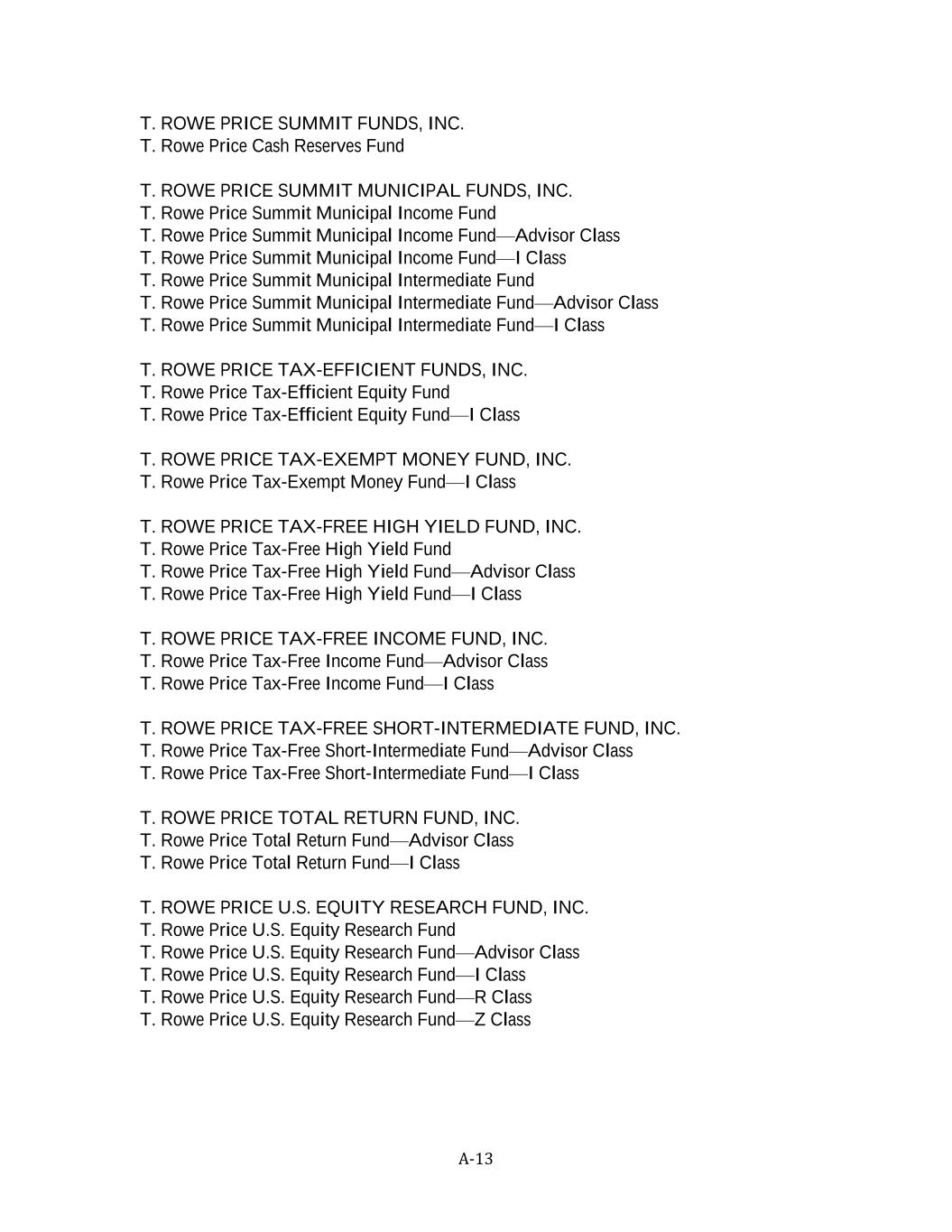 A-13 T. ROWE PRICE SUMMIT FUNDS, INC. T. Rowe Price Cash Reserves Fund T. ROWE PRICE SUMMIT MUNICIPAL FUNDS, INC. T. Rowe Price Summit Municipal Income Fund T. Rowe Price Summit Municipal Income Fund—Advisor Class T. Rowe Price Summit Municipal Income Fund—I Class T. Rowe Price Summit Municipal Intermediate Fund T. Rowe Price Summit Municipal Intermediate Fund—Advisor Class T. Rowe Price Summit Municipal Intermediate Fund—I Class T. ROWE PRICE TAX-EFFICIENT FUNDS, INC. T. Rowe Price Tax-Efficient Equity Fund T. Rowe Price Tax-Efficient Equity Fund—I Class T. ROWE PRICE TAX-EXEMPT MONEY FUND, INC. T. Rowe Price Tax-Exempt Money Fund—I Class T. ROWE PRICE TAX-FREE HIGH YIELD FUND, INC. T. Rowe Price Tax-Free High Yield Fund T. Rowe Price Tax-Free High Yield Fund—Advisor Class T. Rowe Price Tax-Free High Yield Fund—I Class T. ROWE PRICE TAX-FREE INCOME FUND, INC. T. Rowe Price Tax-Free Income Fund—Advisor Class T. Rowe Price Tax-Free Income Fund—I Class T. ROWE PRICE TAX-FREE SHORT-INTERMEDIATE FUND, INC. T. Rowe Price Tax-Free Short-Intermediate Fund—Advisor Class T. Rowe Price Tax-Free Short-Intermediate Fund—I Class T. ROWE PRICE TOTAL RETURN FUND, INC. T. Rowe Price Total Return Fund—Advisor Class T. Rowe Price Total Return Fund—I Class T. ROWE PRICE U.S. EQUITY RESEARCH FUND, INC. T. Rowe Price U.S. Equity Research Fund T. Rowe Price U.S. Equity Research Fund—Advisor Class T. Rowe Price U.S. Equity Research Fund—I Class T. Rowe Price U.S. Equity Research Fund—R Class T. Rowe Price U.S. Equity Research Fund—Z Class