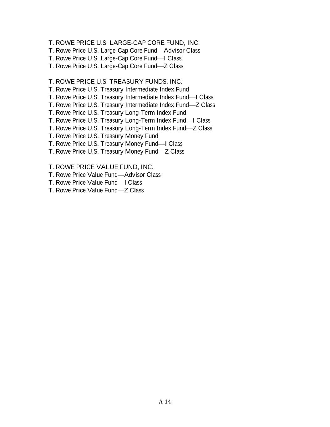 A-14 T. ROWE PRICE U.S. LARGE-CAP CORE FUND, INC. T. Rowe Price U.S. Large-Cap Core Fund—Advisor Class T. Rowe Price U.S. Large-Cap Core Fund—I Class T. Rowe Price U.S. Large-Cap Core Fund—Z Class T. ROWE PRICE U.S. TREASURY FUNDS, INC. T. Rowe Price U.S. Treasury Intermediate Index Fund T. Rowe Price U.S. Treasury Intermediate Index Fund—I Class T. Rowe Price U.S. Treasury Intermediate Index Fund—Z Class T. Rowe Price U.S. Treasury Long-Term Index Fund T. Rowe Price U.S. Treasury Long-Term Index Fund—I Class T. Rowe Price U.S. Treasury Long-Term Index Fund—Z Class T. Rowe Price U.S. Treasury Money Fund T. Rowe Price U.S. Treasury Money Fund—I Class T. Rowe Price U.S. Treasury Money Fund—Z Class T. ROWE PRICE VALUE FUND, INC. T. Rowe Price Value Fund—Advisor Class T. Rowe Price Value Fund—I Class T. Rowe Price Value Fund—Z Class
