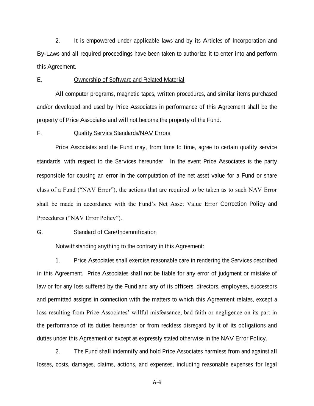 A-4 2. It is empowered under applicable laws and by its Articles of Incorporation and By-Laws and all required proceedings have been taken to authorize it to enter into and perform this Agreement. E. Ownership of Software and Related Material All computer programs, magnetic tapes, written procedures, and similar items purchased and/or developed and used by Price Associates in performance of this Agreement shall be the property of Price Associates and will not become the property of the Fund. F. Quality Service Standards/NAV Errors Price Associates and the Fund may, from time to time, agree to certain quality service standards, with respect to the Services hereunder. In the event Price Associates is the party responsible for causing an error in the computation of the net asset value for a Fund or share class of a Fund (“NAV Error”), the actions that are required to be taken as to such NAV Error shall be made in accordance with the Fund’s Net Asset Value Error Correction Policy and Procedures (“NAV Error Policy”). G. Standard of Care/Indemnification Notwithstanding anything to the contrary in this Agreement: 1. Price Associates shall exercise reasonable care in rendering the Services described in this Agreement. Price Associates shall not be liable for any error of judgment or mistake of law or for any loss suffered by the Fund and any of its officers, directors, employees, successors and permitted assigns in connection with the matters to which this Agreement relates, except a loss resulting from Price Associates’ willful misfeasance, bad faith or negligence on its part in the performance of its duties hereunder or from reckless disregard by it of its obligations and duties under this Agreement or except as expressly stated otherwise in the NAV Error Policy. 2. The Fund shall indemnify and hold Price Associates harmless from and against all losses, costs, damages, claims, actions, and expenses, including reasonable expenses for legal