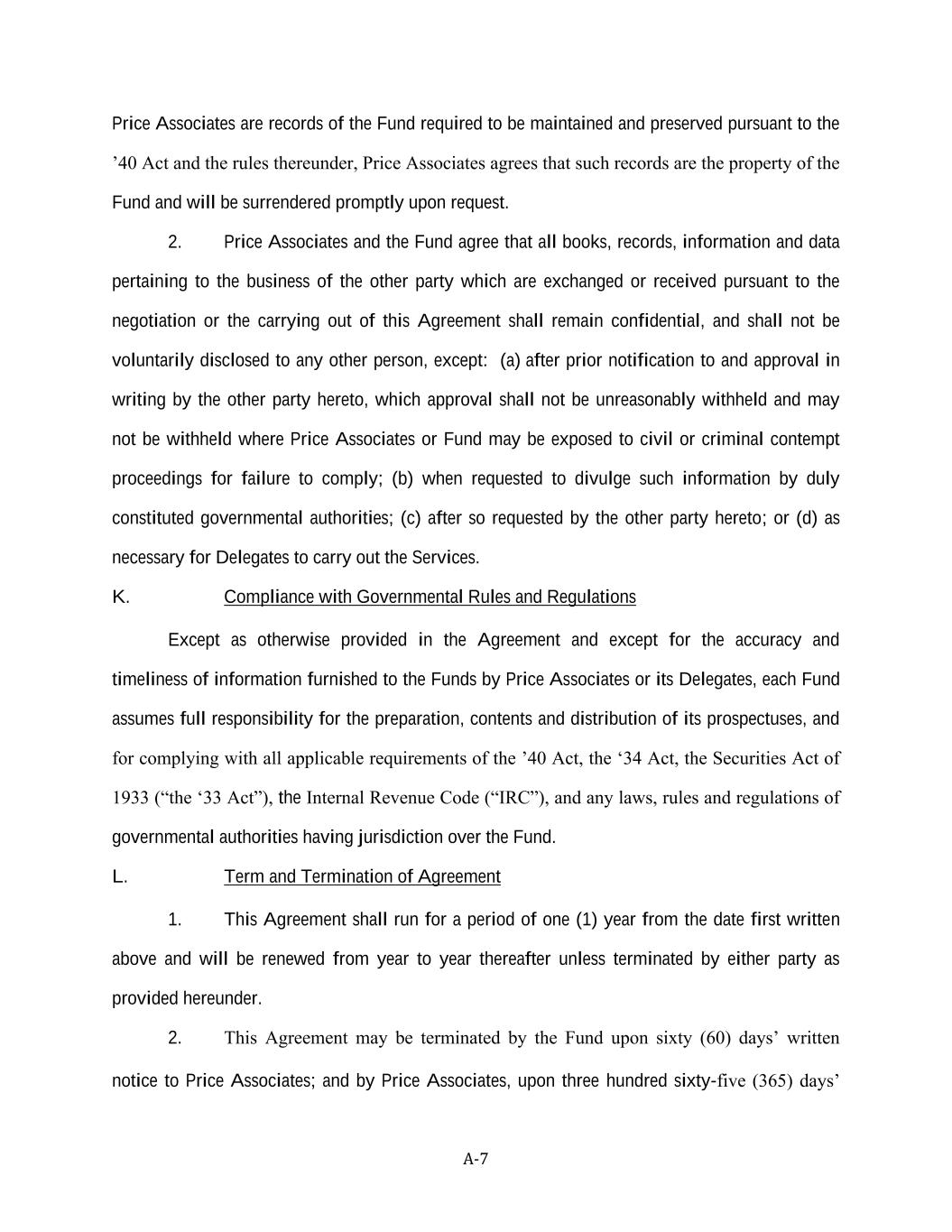 A-7 Price Associates are records of the Fund required to be maintained and preserved pursuant to the ’40 Act and the rules thereunder, Price Associates agrees that such records are the property of the Fund and will be surrendered promptly upon request. 2. Price Associates and the Fund agree that all books, records, information and data pertaining to the business of the other party which are exchanged or received pursuant to the negotiation or the carrying out of this Agreement shall remain confidential, and shall not be voluntarily disclosed to any other person, except: (a) after prior notification to and approval in writing by the other party hereto, which approval shall not be unreasonably withheld and may not be withheld where Price Associates or Fund may be exposed to civil or criminal contempt proceedings for failure to comply; (b) when requested to divulge such information by duly constituted governmental authorities; (c) after so requested by the other party hereto; or (d) as necessary for Delegates to carry out the Services. K. Compliance with Governmental Rules and Regulations Except as otherwise provided in the Agreement and except for the accuracy and timeliness of information furnished to the Funds by Price Associates or its Delegates, each Fund assumes full responsibility for the preparation, contents and distribution of its prospectuses, and for complying with all applicable requirements of the ’40 Act, the ‘34 Act, the Securities Act of 1933 (“the ‘33 Act”), the Internal Revenue Code (“IRC”), and any laws, rules and regulations of governmental authorities having jurisdiction over the Fund. L. Term and Termination of Agreement 1. This Agreement shall run for a period of one (1) year from the date first written above and will be renewed from year to year thereafter unless terminated by either party as provided hereunder. 2. This Agreement may be terminated by the Fund upon sixty (60) days’ written notice to Price Associates; and by Price Associates, upon three hundred sixty-five (365) days’