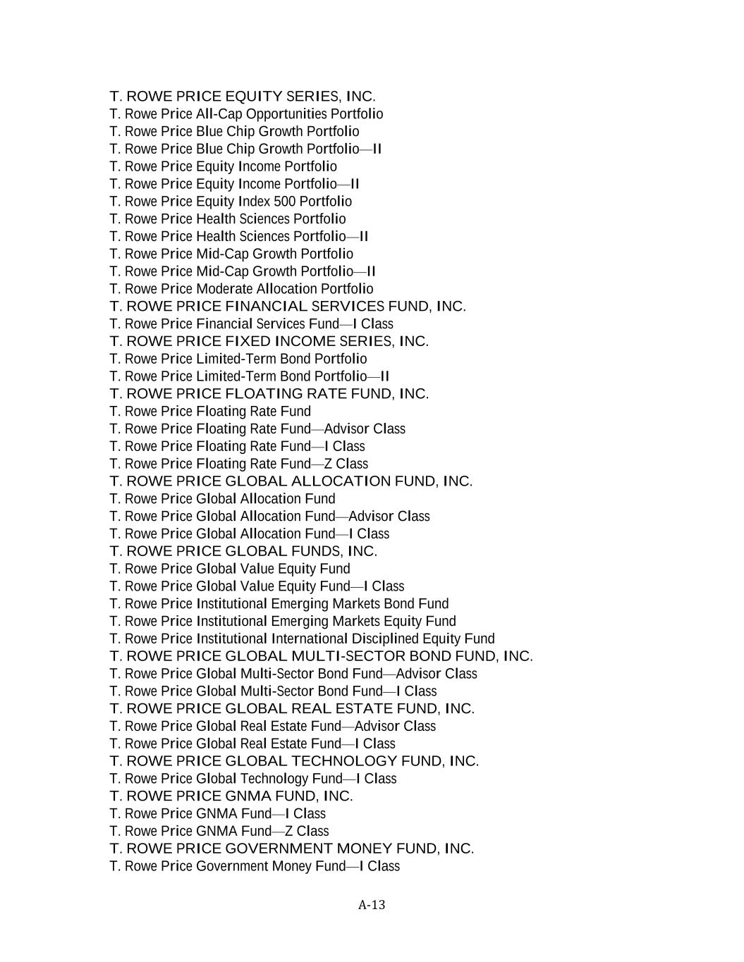 A-13 T. ROWE PRICE EQUITY SERIES, INC. T. Rowe Price All-Cap Opportunities Portfolio T. Rowe Price Blue Chip Growth Portfolio T. Rowe Price Blue Chip Growth Portfolio—II T. Rowe Price Equity Income Portfolio T. Rowe Price Equity Income Portfolio—II T. Rowe Price Equity Index 500 Portfolio T. Rowe Price Health Sciences Portfolio T. Rowe Price Health Sciences Portfolio—II T. Rowe Price Mid-Cap Growth Portfolio T. Rowe Price Mid-Cap Growth Portfolio—II T. Rowe Price Moderate Allocation Portfolio T. ROWE PRICE FINANCIAL SERVICES FUND, INC. T. Rowe Price Financial Services Fund—I Class T. ROWE PRICE FIXED INCOME SERIES, INC. T. Rowe Price Limited-Term Bond Portfolio T. Rowe Price Limited-Term Bond Portfolio—II T. ROWE PRICE FLOATING RATE FUND, INC. T. Rowe Price Floating Rate Fund T. Rowe Price Floating Rate Fund—Advisor Class T. Rowe Price Floating Rate Fund—I Class T. Rowe Price Floating Rate Fund—Z Class T. ROWE PRICE GLOBAL ALLOCATION FUND, INC. T. Rowe Price Global Allocation Fund T. Rowe Price Global Allocation Fund—Advisor Class T. Rowe Price Global Allocation Fund—I Class T. ROWE PRICE GLOBAL FUNDS, INC. T. Rowe Price Global Value Equity Fund T. Rowe Price Global Value Equity Fund—I Class T. Rowe Price Institutional Emerging Markets Bond Fund T. Rowe Price Institutional Emerging Markets Equity Fund T. Rowe Price Institutional International Disciplined Equity Fund T. ROWE PRICE GLOBAL MULTI-SECTOR BOND FUND, INC. T. Rowe Price Global Multi-Sector Bond Fund—Advisor Class T. Rowe Price Global Multi-Sector Bond Fund—I Class T. ROWE PRICE GLOBAL REAL ESTATE FUND, INC. T. Rowe Price Global Real Estate Fund—Advisor Class T. Rowe Price Global Real Estate Fund—I Class T. ROWE PRICE GLOBAL TECHNOLOGY FUND, INC. T. Rowe Price Global Technology Fund—I Class T. ROWE PRICE GNMA FUND, INC. T. Rowe Price GNMA Fund—I Class T. Rowe Price GNMA Fund—Z Class T. ROWE PRICE GOVERNMENT MONEY FUND, INC. T. Rowe Price Government Money Fund—I Class