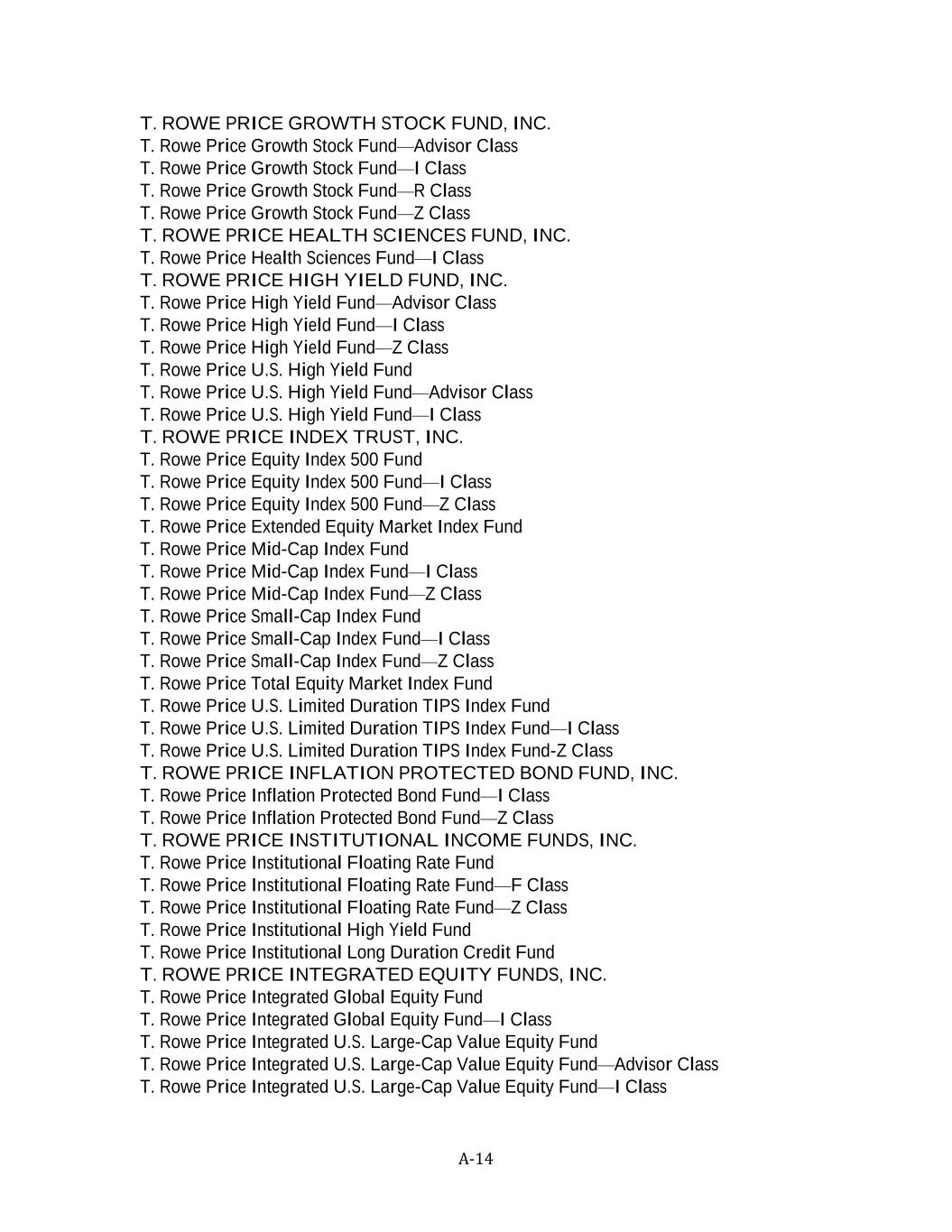 A-14 T. ROWE PRICE GROWTH STOCK FUND, INC. T. Rowe Price Growth Stock Fund—Advisor Class T. Rowe Price Growth Stock Fund—I Class T. Rowe Price Growth Stock Fund—R Class T. Rowe Price Growth Stock Fund—Z Class T. ROWE PRICE HEALTH SCIENCES FUND, INC. T. Rowe Price Health Sciences Fund—I Class T. ROWE PRICE HIGH YIELD FUND, INC. T. Rowe Price High Yield Fund—Advisor Class T. Rowe Price High Yield Fund—I Class T. Rowe Price High Yield Fund—Z Class T. Rowe Price U.S. High Yield Fund T. Rowe Price U.S. High Yield Fund—Advisor Class T. Rowe Price U.S. High Yield Fund—I Class T. ROWE PRICE INDEX TRUST, INC. T. Rowe Price Equity Index 500 Fund T. Rowe Price Equity Index 500 Fund—I Class T. Rowe Price Equity Index 500 Fund—Z Class T. Rowe Price Extended Equity Market Index Fund T. Rowe Price Mid-Cap Index Fund T. Rowe Price Mid-Cap Index Fund—I Class T. Rowe Price Mid-Cap Index Fund—Z Class T. Rowe Price Small-Cap Index Fund T. Rowe Price Small-Cap Index Fund—I Class T. Rowe Price Small-Cap Index Fund—Z Class T. Rowe Price Total Equity Market Index Fund T. Rowe Price U.S. Limited Duration TIPS Index Fund T. Rowe Price U.S. Limited Duration TIPS Index Fund—I Class T. Rowe Price U.S. Limited Duration TIPS Index Fund-Z Class T. ROWE PRICE INFLATION PROTECTED BOND FUND, INC. T. Rowe Price Inflation Protected Bond Fund—I Class T. Rowe Price Inflation Protected Bond Fund—Z Class T. ROWE PRICE INSTITUTIONAL INCOME FUNDS, INC. T. Rowe Price Institutional Floating Rate Fund T. Rowe Price Institutional Floating Rate Fund—F Class T. Rowe Price Institutional Floating Rate Fund—Z Class T. Rowe Price Institutional High Yield Fund T. Rowe Price Institutional Long Duration Credit Fund T. ROWE PRICE INTEGRATED EQUITY FUNDS, INC. T. Rowe Price Integrated Global Equity Fund T. Rowe Price Integrated Global Equity Fund—I Class T. Rowe Price Integrated U.S. Large-Cap Value Equity Fund T. Rowe Price Integrated U.S. Large-Cap Value Equity Fund—Advisor Class T. Rowe Price Integrated U.S. Large-Cap Value Equity Fund—I Class