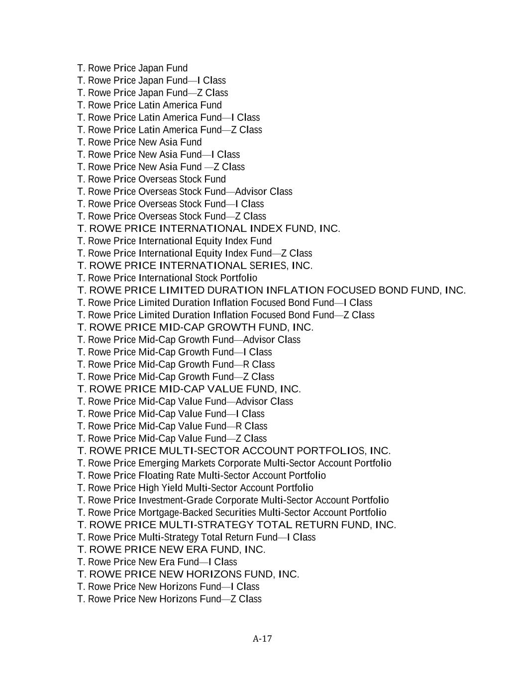 A-17 T. Rowe Price Japan Fund T. Rowe Price Japan Fund—I Class T. Rowe Price Japan Fund—Z Class T. Rowe Price Latin America Fund T. Rowe Price Latin America Fund—I Class T. Rowe Price Latin America Fund—Z Class T. Rowe Price New Asia Fund T. Rowe Price New Asia Fund—I Class T. Rowe Price New Asia Fund —Z Class T. Rowe Price Overseas Stock Fund T. Rowe Price Overseas Stock Fund—Advisor Class T. Rowe Price Overseas Stock Fund—I Class T. Rowe Price Overseas Stock Fund—Z Class T. ROWE PRICE INTERNATIONAL INDEX FUND, INC. T. Rowe Price International Equity Index Fund T. Rowe Price International Equity Index Fund—Z Class T. ROWE PRICE INTERNATIONAL SERIES, INC. T. Rowe Price International Stock Portfolio T. ROWE PRICE LIMITED DURATION INFLATION FOCUSED BOND FUND, INC. T. Rowe Price Limited Duration Inflation Focused Bond Fund—I Class T. Rowe Price Limited Duration Inflation Focused Bond Fund—Z Class T. ROWE PRICE MID-CAP GROWTH FUND, INC. T. Rowe Price Mid-Cap Growth Fund—Advisor Class T. Rowe Price Mid-Cap Growth Fund—I Class T. Rowe Price Mid-Cap Growth Fund—R Class T. Rowe Price Mid-Cap Growth Fund—Z Class T. ROWE PRICE MID-CAP VALUE FUND, INC. T. Rowe Price Mid-Cap Value Fund—Advisor Class T. Rowe Price Mid-Cap Value Fund—I Class T. Rowe Price Mid-Cap Value Fund—R Class T. Rowe Price Mid-Cap Value Fund—Z Class T. ROWE PRICE MULTI-SECTOR ACCOUNT PORTFOLIOS, INC. T. Rowe Price Emerging Markets Corporate Multi-Sector Account Portfolio T. Rowe Price Floating Rate Multi-Sector Account Portfolio T. Rowe Price High Yield Multi-Sector Account Portfolio T. Rowe Price Investment-Grade Corporate Multi-Sector Account Portfolio T. Rowe Price Mortgage-Backed Securities Multi-Sector Account Portfolio T. ROWE PRICE MULTI-STRATEGY TOTAL RETURN FUND, INC. T. Rowe Price Multi-Strategy Total Return Fund—I Class T. ROWE PRICE NEW ERA FUND, INC. T. Rowe Price New Era Fund—I Class T. ROWE PRICE NEW HORIZONS FUND, INC. T. Rowe Price New Horizons Fund—I Class T. Rowe Price New Horizons Fund—Z Class