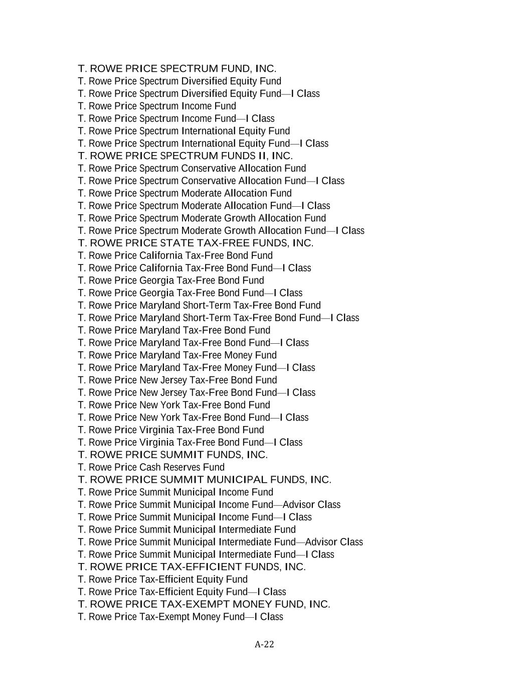 A-22 T. ROWE PRICE SPECTRUM FUND, INC. T. Rowe Price Spectrum Diversified Equity Fund T. Rowe Price Spectrum Diversified Equity Fund—I Class T. Rowe Price Spectrum Income Fund T. Rowe Price Spectrum Income Fund—I Class T. Rowe Price Spectrum International Equity Fund T. Rowe Price Spectrum International Equity Fund—I Class T. ROWE PRICE SPECTRUM FUNDS II, INC. T. Rowe Price Spectrum Conservative Allocation Fund T. Rowe Price Spectrum Conservative Allocation Fund—I Class T. Rowe Price Spectrum Moderate Allocation Fund T. Rowe Price Spectrum Moderate Allocation Fund—I Class T. Rowe Price Spectrum Moderate Growth Allocation Fund T. Rowe Price Spectrum Moderate Growth Allocation Fund—I Class T. ROWE PRICE STATE TAX-FREE FUNDS, INC. T. Rowe Price California Tax-Free Bond Fund T. Rowe Price California Tax-Free Bond Fund—I Class T. Rowe Price Georgia Tax-Free Bond Fund T. Rowe Price Georgia Tax-Free Bond Fund—I Class T. Rowe Price Maryland Short-Term Tax-Free Bond Fund T. Rowe Price Maryland Short-Term Tax-Free Bond Fund—I Class T. Rowe Price Maryland Tax-Free Bond Fund T. Rowe Price Maryland Tax-Free Bond Fund—I Class T. Rowe Price Maryland Tax-Free Money Fund T. Rowe Price Maryland Tax-Free Money Fund—I Class T. Rowe Price New Jersey Tax-Free Bond Fund T. Rowe Price New Jersey Tax-Free Bond Fund—I Class T. Rowe Price New York Tax-Free Bond Fund T. Rowe Price New York Tax-Free Bond Fund—I Class T. Rowe Price Virginia Tax-Free Bond Fund T. Rowe Price Virginia Tax-Free Bond Fund—I Class T. ROWE PRICE SUMMIT FUNDS, INC. T. Rowe Price Cash Reserves Fund T. ROWE PRICE SUMMIT MUNICIPAL FUNDS, INC. T. Rowe Price Summit Municipal Income Fund T. Rowe Price Summit Municipal Income Fund—Advisor Class T. Rowe Price Summit Municipal Income Fund—I Class T. Rowe Price Summit Municipal Intermediate Fund T. Rowe Price Summit Municipal Intermediate Fund—Advisor Class T. Rowe Price Summit Municipal Intermediate Fund—I Class T. ROWE PRICE TAX-EFFICIENT FUNDS, INC. T. Rowe Price Tax-Efficient Equity Fund T. Rowe Price Tax-Efficient Equity Fund—I Class T. ROWE PRICE TAX-EXEMPT MONEY FUND, INC. T. Rowe Price Tax-Exempt Money Fund—I Class