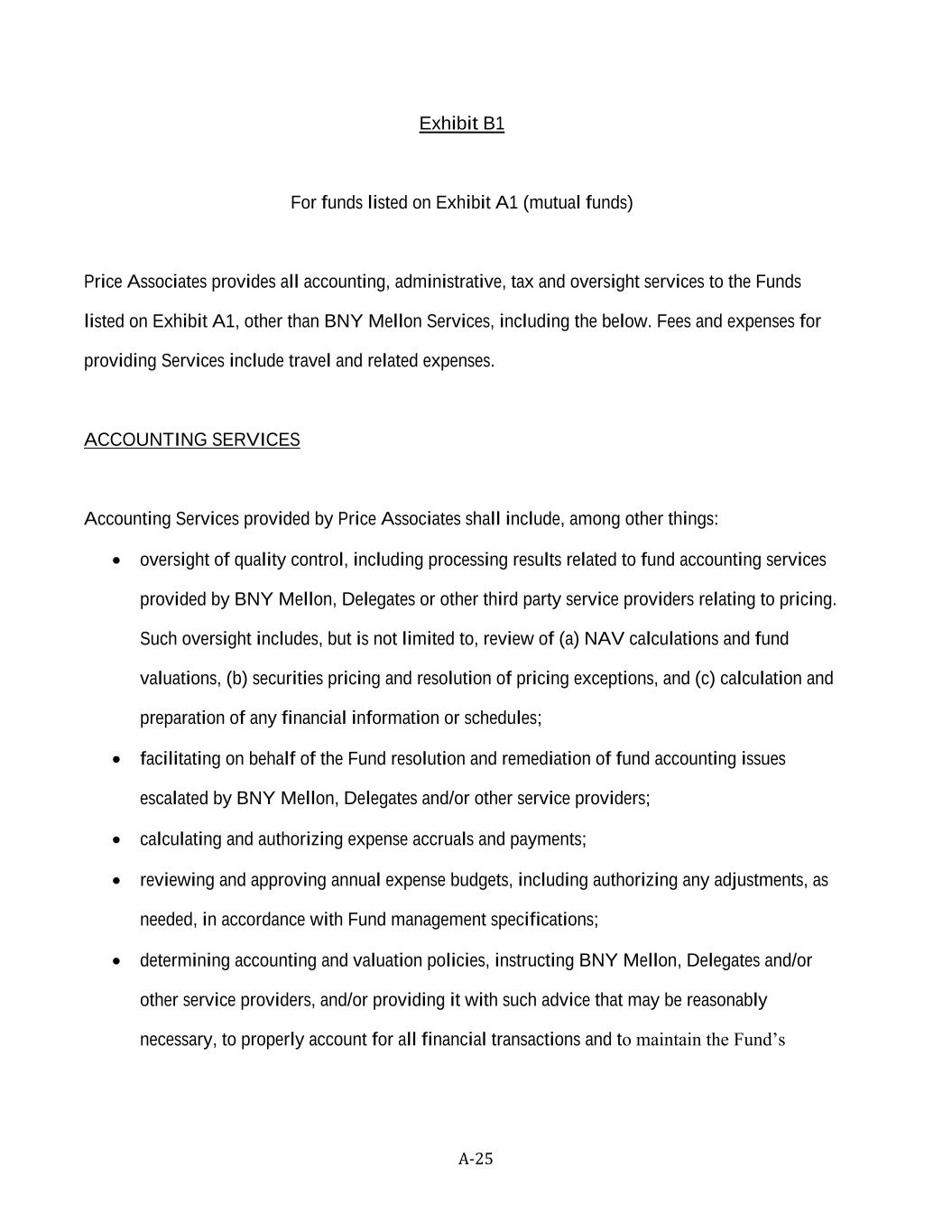 A-25 Exhibit B1 For funds listed on Exhibit A1 (mutual funds) Price Associates provides all accounting, administrative, tax and oversight services to the Funds listed on Exhibit A1, other than BNY Mellon Services, including the below. Fees and expenses for providing Services include travel and related expenses. ACCOUNTING SERVICES Accounting Services provided by Price Associates shall include, among other things: • oversight of quality control, including processing results related to fund accounting services provided by BNY Mellon, Delegates or other third party service providers relating to pricing. Such oversight includes, but is not limited to, review of (a) NAV calculations and fund valuations, (b) securities pricing and resolution of pricing exceptions, and (c) calculation and preparation of any financial information or schedules; • facilitating on behalf of the Fund resolution and remediation of fund accounting issues escalated by BNY Mellon, Delegates and/or other service providers; • calculating and authorizing expense accruals and payments; • reviewing and approving annual expense budgets, including authorizing any adjustments, as needed, in accordance with Fund management specifications; • determining accounting and valuation policies, instructing BNY Mellon, Delegates and/or other service providers, and/or providing it with such advice that may be reasonably necessary, to properly account for all financial transactions and to maintain the Fund’s