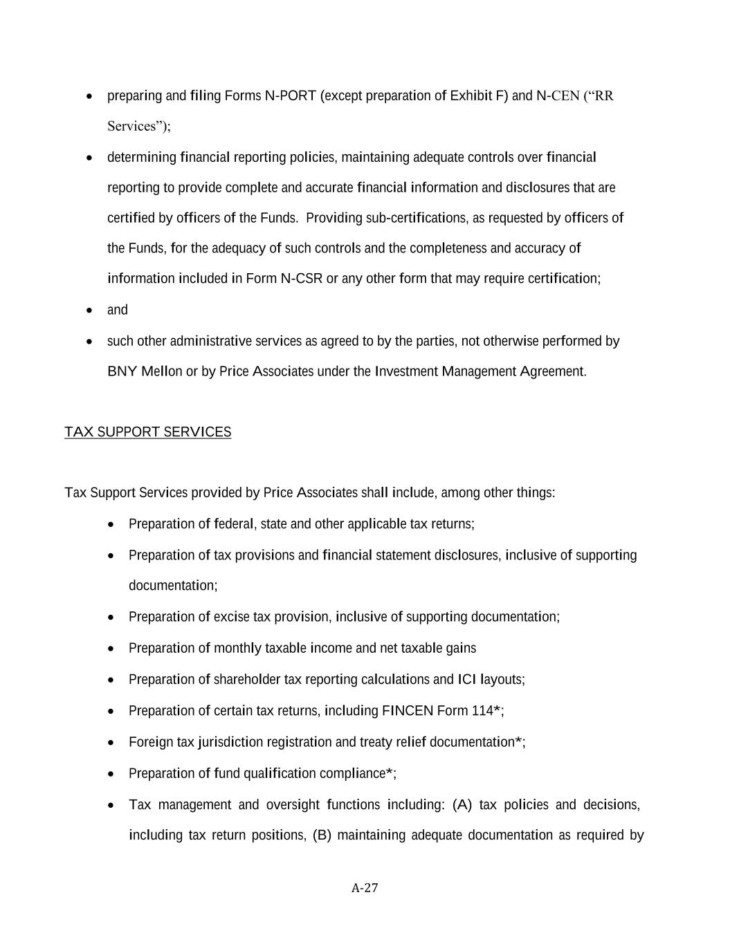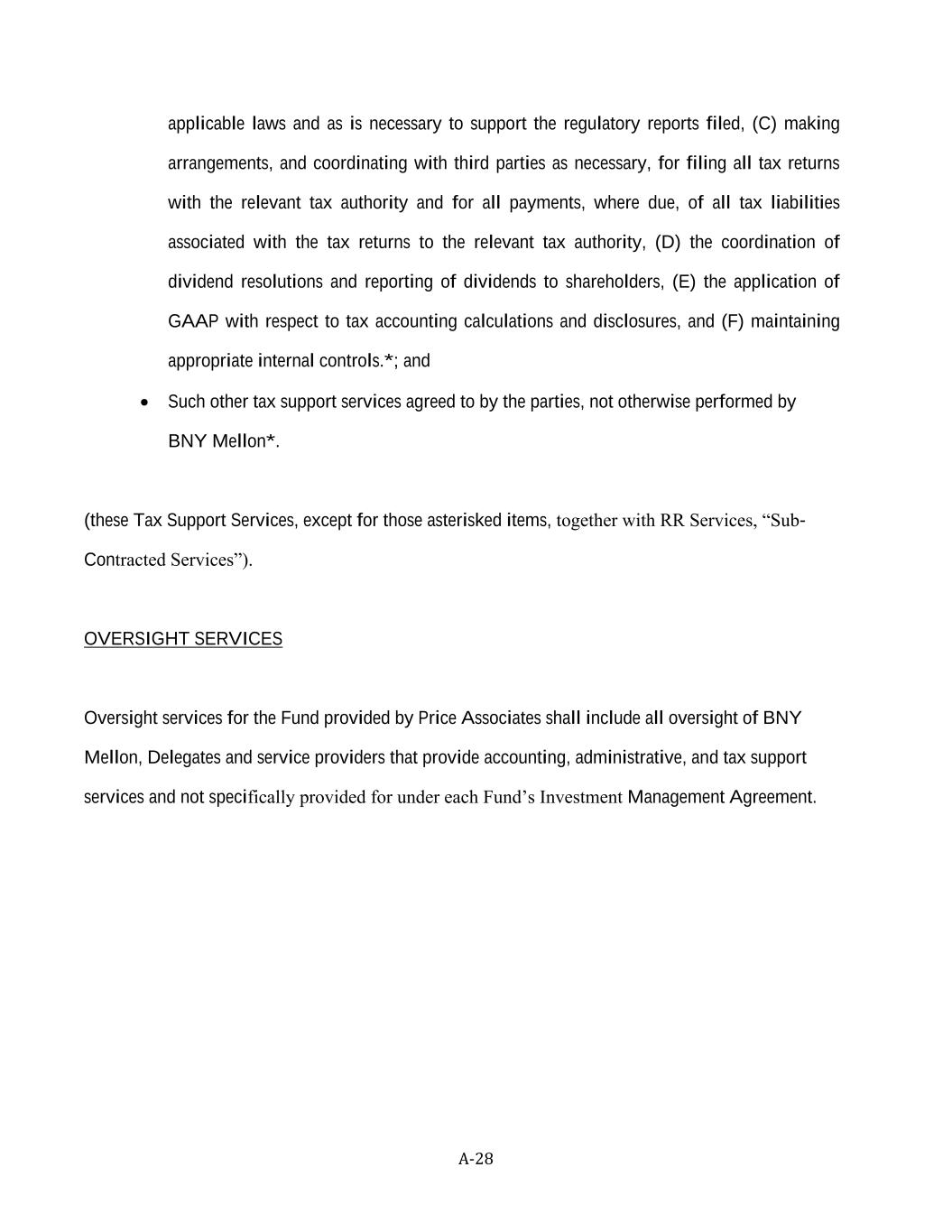 A-28 applicable laws and as is necessary to support the regulatory reports filed, (C) making arrangements, and coordinating with third parties as necessary, for filing all tax returns with the relevant tax authority and for all payments, where due, of all tax liabilities associated with the tax returns to the relevant tax authority, (D) the coordination of dividend resolutions and reporting of dividends to shareholders, (E) the application of GAAP with respect to tax accounting calculations and disclosures, and (F) maintaining appropriate internal controls.*; and • Such other tax support services agreed to by the parties, not otherwise performed by BNY Mellon*. (these Tax Support Services, except for those asterisked items, together with RR Services, “Sub- Contracted Services”). OVERSIGHT SERVICES Oversight services for the Fund provided by Price Associates shall include all oversight of BNY Mellon, Delegates and service providers that provide accounting, administrative, and tax support services and not specifically provided for under each Fund’s Investment Management Agreement.
