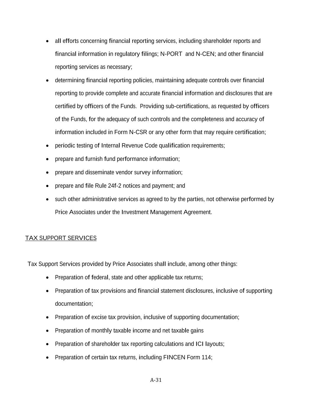 A-31 • all efforts concerning financial reporting services, including shareholder reports and financial information in regulatory filings; N-PORT and N-CEN; and other financial reporting services as necessary; • determining financial reporting policies, maintaining adequate controls over financial reporting to provide complete and accurate financial information and disclosures that are certified by officers of the Funds. Providing sub-certifications, as requested by officers of the Funds, for the adequacy of such controls and the completeness and accuracy of information included in Form N-CSR or any other form that may require certification; • periodic testing of Internal Revenue Code qualification requirements; • prepare and furnish fund performance information; • prepare and disseminate vendor survey information; • prepare and file Rule 24f-2 notices and payment; and • such other administrative services as agreed to by the parties, not otherwise performed by Price Associates under the Investment Management Agreement. TAX SUPPORT SERVICES Tax Support Services provided by Price Associates shall include, among other things: • Preparation of federal, state and other applicable tax returns; • Preparation of tax provisions and financial statement disclosures, inclusive of supporting documentation; • Preparation of excise tax provision, inclusive of supporting documentation; • Preparation of monthly taxable income and net taxable gains • Preparation of shareholder tax reporting calculations and ICI layouts; • Preparation of certain tax returns, including FINCEN Form 114;