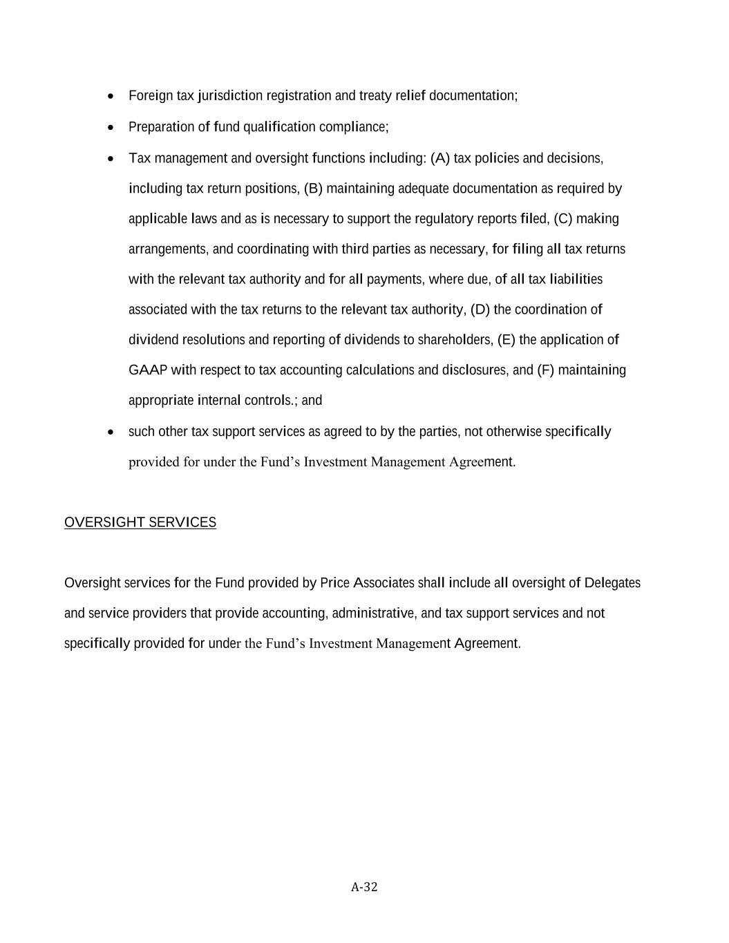 A-32 • Foreign tax jurisdiction registration and treaty relief documentation; • Preparation of fund qualification compliance; • Tax management and oversight functions including: (A) tax policies and decisions, including tax return positions, (B) maintaining adequate documentation as required by applicable laws and as is necessary to support the regulatory reports filed, (C) making arrangements, and coordinating with third parties as necessary, for filing all tax returns with the relevant tax authority and for all payments, where due, of all tax liabilities associated with the tax returns to the relevant tax authority, (D) the coordination of dividend resolutions and reporting of dividends to shareholders, (E) the application of GAAP with respect to tax accounting calculations and disclosures, and (F) maintaining appropriate internal controls.; and • such other tax support services as agreed to by the parties, not otherwise specifically provided for under the Fund’s Investment Management Agreement. OVERSIGHT SERVICES Oversight services for the Fund provided by Price Associates shall include all oversight of Delegates and service providers that provide accounting, administrative, and tax support services and not specifically provided for under the Fund’s Investment Management Agreement.