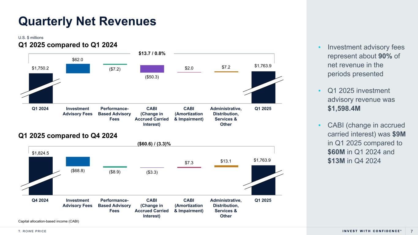 6T. R O W E P R I C E Firmwide AUM includes assets managed by T. Rowe Price Associates, Inc., and its investment advisory affiliates. Institutional includes defined contribution assets, including assets sourced from intermediaries and the firm's full-service recordkeeping business. Retail includes our direct-marketed business and financial intermediaries Unfunded capital commitments will transition to fee basis assets under management or assets under advisement as capital is called and deployed. 1 See page 15 for further details on retirement assets. Assets Under Management and Net Flows U.S. $ billions ▪ Retirement assets are 66% of AUM1 ▪ U.S. defined contribution AUM of $713B ▪ Target date AUM of $484B ▪ Alternative AUM includes private markets ($20B), CLOs ($20B), and liquid strategies ($13B) ▪ $17.1B in unfunded capital commitments compared to $16.2B at December 31, 2024 ▪ Outflows largely concentrated in U.S. equities ▪ Target date inflows of $6.3B in Q1 2025 ▪ Alternatives flows are net of $0.7B in manager-driven distributions Firmwide flows by quarter ($B) Q1'24 Q2'24 Q3'24 Q4'24 Q1'25 (8.0) (3.7) (12.2) (19.3) (8.6) Net Flows Q1 2025 Assets Under Management As of March 31, 2025Asset Class Client Type Geography Equity $ (12.8) $ (14.9) $ (16.1) $ (8.2) $ (19.2) FI 0.2 7.8 1.1 3.5 5.4 MA 5.5 1.6 1.9 (15.5) 5.5 Alts (0.9) 1.8 0.9 0.9 (0.3) Inst. $ (0.5) $ 7.6 $ (2.2) $ 4.9 $ (1.7) Retail (7.5) (11.3) (10.0) (24.2) (6.9) U.S. $ (5.9) $ (5.2) $ (13.1) $ (20.2) $ (8.0) APAC, EMEA, Canada (2.1) 1.5 0.9 0.9 (0.6) Retail Inst. U.S. APAC, EMEA, Canada $803 $810 $832 $830 $773 $171 $180 $186 $188 $196 $521 $529 $561 $536 $544 $48 $50 $52 $53 $53 Q1'24 Q2'24 Q3'24 Q4'24 Q1'25 Fixed Income Multi-Asset Alts Equity $676 $675 $695 $666 $640 $866 $894 $936 $941 $926 Q1'24 Q2'24 Q3'24 Q4'24 Q1'25 $1,412 $1,434 $1,490 $1,465 $1,429 $131 $135 $141 $142 $137 Q1'24 Q2'24 Q3'24 Q4'24 Q1'25 Assets Under Management Assets Under Management Assets Under Management Net Flows Net Flows Net Flows Q1'24 Q2'24 Q3'24 Q4'24 Q1'25 Q1'24 Q2'24 Q3'24 Q4'24 Q1'25 Q1'24 Q2'24 Q3'24 Q4'24 Q1'25