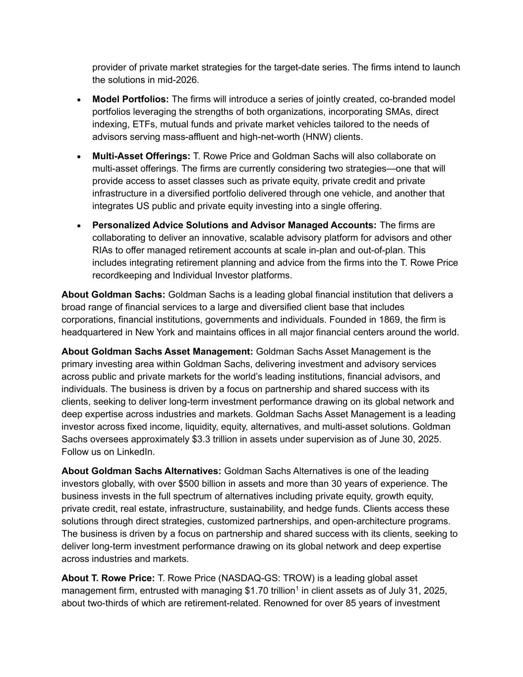 provider of private market strategies for the target-date series. The firms intend to launch the solutions in mid-2026. Model Portfolios: The firms will introduce a series of jointly created, co-branded model portfolios leveraging the strengths of both organizations, incorporating SMAs, direct indexing, ETFs, mutual funds and private market vehicles tailored to the needs of advisors serving mass-affluent and high-net-worth (HNW) clients. Multi-Asset Offerings: T. Rowe Price and Goldman Sachs will also collaborate on multi-asset offerings. The firms are currently considering two strategies—one that will provide access to asset classes such as private equity, private credit and private infrastructure in a diversified portfolio delivered through one vehicle, and another that integrates US public and private equity investing into a single offering. Personalized Advice Solutions and Advisor Managed Accounts: The firms are collaborating to deliver an innovative, scalable advisory platform for advisors and other RIAs to offer managed retirement accounts at scale in-plan and out-of-plan. This includes integrating retirement planning and advice from the firms into the T. Rowe Price recordkeeping and Individual Investor platforms. About Goldman Sachs: Goldman Sachs is a leading global financial institution that delivers a broad range of financial services to a large and diversified client base that includes corporations, financial institutions, governments and individuals. Founded in 1869, the firm is headquartered in New York and maintains offices in all major financial centers around the world. About Goldman Sachs Asset Management: Goldman Sachs Asset Management is the primary investing area within Goldman Sachs, delivering investment and advisory services across public and private markets for the world’s leading institutions, financial advisors, and individuals. The business is driven by a focus on partnership and shared success with its clients, seeking to deliver long-term investment performance drawing on its global network and deep expertise across industries and markets. Goldman Sachs Asset Management is a leading investor across fixed income, liquidity, equity, alternatives, and multi-asset solutions. Goldman Sachs oversees approximately $3.3 trillion in assets under supervision as of June 30, 2025. Follow us on LinkedIn. About Goldman Sachs Alternatives: Goldman Sachs Alternatives is one of the leading investors globally, with over $500 billion in assets and more than 30 years of experience. The business invests in the full spectrum of alternatives including private equity, growth equity, private credit, real estate, infrastructure, sustainability, and hedge funds. Clients access these solutions through direct strategies, customized partnerships, and open-architecture programs. The business is driven by a focus on partnership and shared success with its clients, seeking to deliver long-term investment performance drawing on its global network and deep expertise across industries and markets. About T. Rowe Price: T. Rowe Price (NASDAQ-GS: TROW) is a leading global asset management firm, entrusted with managing $1.70 trillion1 in client assets as of July 31, 2025, about two-thirds of which are retirement-related. Renowned for over 85 years of investment