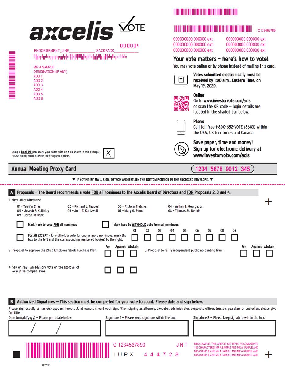 MMMMMMMMMMMM MMMMMMMMMMMMMMM C123456789 000000000.000000 ext 000000000.000000 ext 000000000.000000 ext 000000000.000000 ext 000000000.000000 ext 000000000.000000 ext 000004 ENDORSEMENT_LINE______________ SACKPACK_____________ Your vote matters – here’s how to vote! You may vote online or by phone instead of mailing this card. Votes submitted electronically must be MR A SAMPLE DESIGNATION (IF ANY) ADD 1 ADD 2 ADD 3 ADD 4 ADD 5 ADD 6 received by 1:00 a.m., Eastern Time, on May 19, 2020. Online GIof ntoo welwewct.rinovneicstvoortviontge,.com/acls delete QR code and control # or scan the QR code — login details are located in the shaded bar below. Phone Call toll free 1-800-652-VOTE (8683) within the USA, US territories and Canada Save paper, time and money! Sign up for electronic delivery at www.investorvote.com/acls Using a black ink pen, mark your votes with an X as shown in this example. Please do not write outside the designated areas. q IF VOTING BY MAIL, SIGN, DETACH AND RETURN THE BOTTOM PORTION IN THE ENCLOSED ENVELOPE. q + 1. Election of Directors: 01 – Tzu-Yin Chiu 05 – Joseph P. Keithley 09 – Jorge Titinger 02 – Richard J. Faubert 06 – John T. Kurtzweil 03 – R. John Fletcher 07 – Mary G. Puma 04 – Arthur L. George, Jr. 08 – Thomas St. Dennis Mark here to vote FOR all nominees Mark here to WITHHOLD vote from all nominees 01 02 03 04 05 06 07 08 09 For All EXCEPT - To withhold a vote for one or more nominees, mark the box to the left and the corresponding numbered box(es) to the right. ForAgainst Abstain ForAgainst Abstain 2. Proposal to approve the 2020 Employee Stock Purchase Plan 3. Proposal to ratify independent public accounting firm. 4. Say on Pay - An advisory vote on the approval of executive compensation. Please sign exactly as name(s) appears hereon. Joint owners should each sign. When signing as attorney, executor, administrator, corporate officer, trustee, guardian, or custodian, please give full title. Date (mm/dd/yyyy) — Please print date below. Signature 1 — Please keep signature within the box. Signature 2 — Please keep signature within the box. MMMMMMM C 1234567890 J N T 4 4 7 2 8 MR A SAMPLE (THIS AREA IS SET UP TO ACCOMMODATE 140 CHARACTERS) MR A SAMPLE AND MR A SAMPLE AND MR A SAMPLE AND MR A SAMPLE AND MR A SAMPLE AND MR A SAMPLE AND MR A SAMPLE AND MR A SAMPLE AND + 1 U P X 4 0369JA MMMMMMMMM B Authorized Signatures — This section must be completed for your vote to count. Please date and sign below. A Proposals — The Board recommends a vote FOR all eight of the Axcelis Board of Directors’ nominees and FOR Proposals 2, 3 and 4. Annual Meeting Proxy Card1234 5678 9012 345