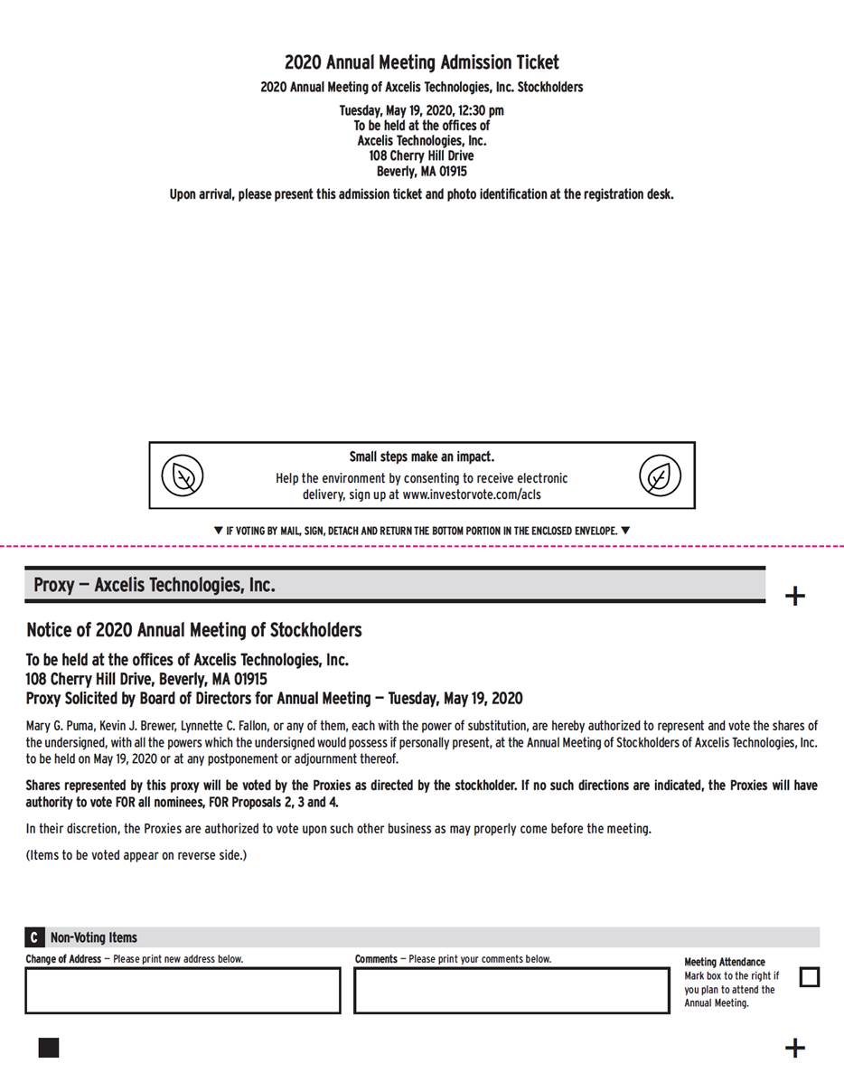 2020 Annual Meeting Admission Ticket 2020 Annual Meeting of Axcelis Technologies, Inc. Stockholders Tuesday, May 19, 2020, 12:30 pm To be held at the offices of Axcelis Technologies, Inc. 108 Cherry Hill Drive Beverly, MA 01915 Upon arrival, please present this admission ticket and photo identification at the registration desk. q IF VOTING BY MAIL, SIGN, DETACH AND RETURN THE BOTTOM PORTION IN THE ENCLOSED ENVELOPE. q + Notice of 2020 Annual Meeting of Stockholders To be held at the offices of Axcelis Technologies, Inc. 108 Cherry Hill Drive, Beverly, MA 01915 Proxy Solicited by Board of Directors for Annual Meeting — Tuesday, May 19, 2020 Mary G. Puma, Kevin J. Brewer, Lynnette C. Fallon, or any of them, each with the power of substitution, are hereby authorized to represent and vote the shares of the undersigned, with all the powers which the undersigned would possess if personally present, at the Annual Meeting of Stockholders of Axcelis Technologies, Inc. to be held on May 19, 2020 or at any postponement or adjournment thereof. Shares represented by this proxy will be voted by the Proxies as directed by the stockholder. If no such directions are indicated, the Proxies will have authority to vote FOR all nominees, FOR Proposals 2, 3 and 4. In their discretion, the Proxies are authorized to vote upon such other business as may properly come before the meeting. (Items to be voted appear on reverse side.) Change of Address — Please print new address below. Comments — Please print your comments below. Meeting Attendance Mark box to the right if you plan to attend the Annual Meeting. + C Non-Voting Items Proxy — Axcelis Technologies, Inc. Small steps make an impact. Help the environment by consenting to receive electronic delivery, sign up at www.investorvote.com/acls