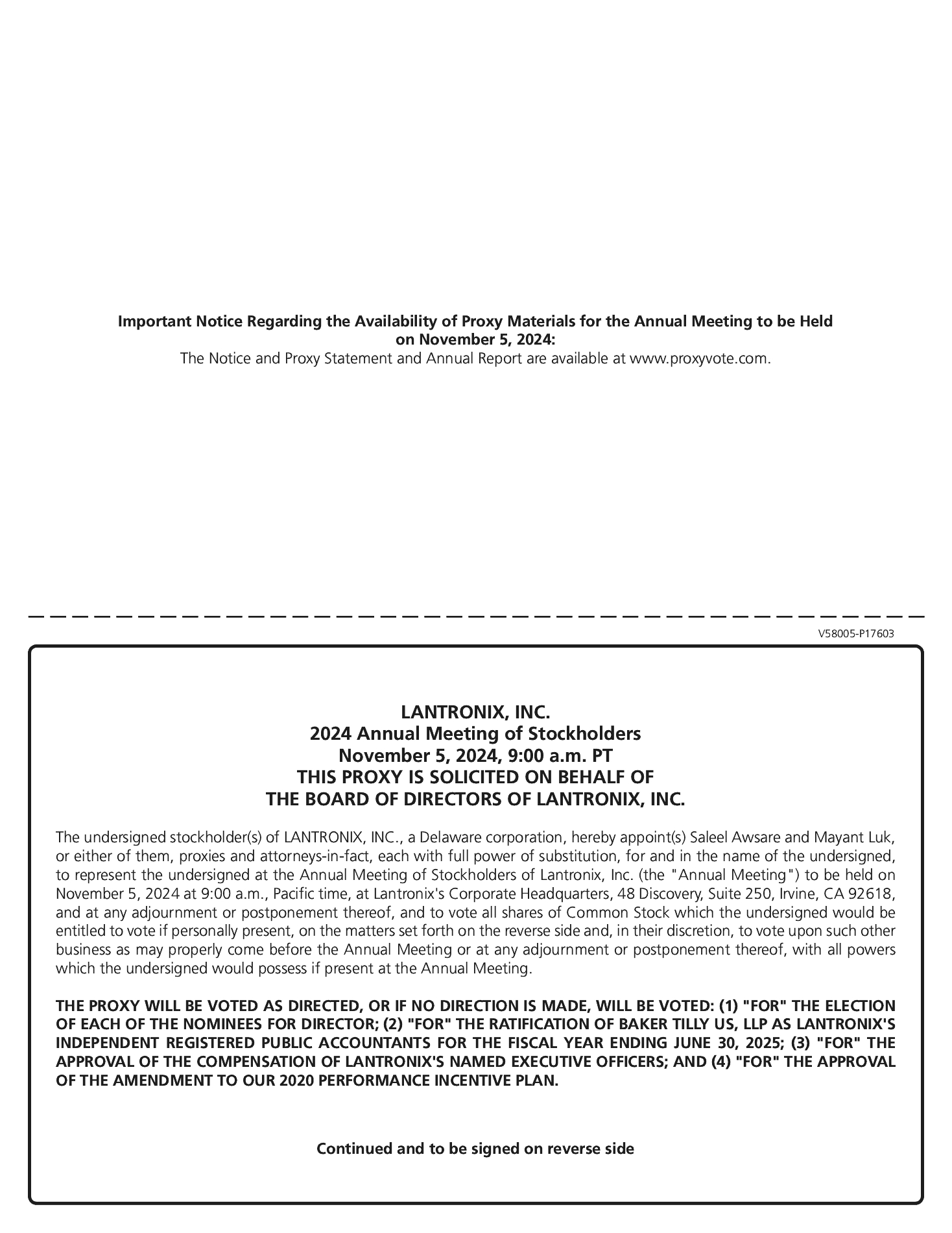 receive a separate set of proxy materials, please send your request to: Lantronix, Inc., 48 Discovery, Suite 250, Irvine, California 92618, Attention: Corporate Secretary, or contact our Corporate Secretary by phone at (949) 453-3990. You may also contact us if you received multiple copies of the proxy materials and would prefer to receive a single copy in the future.