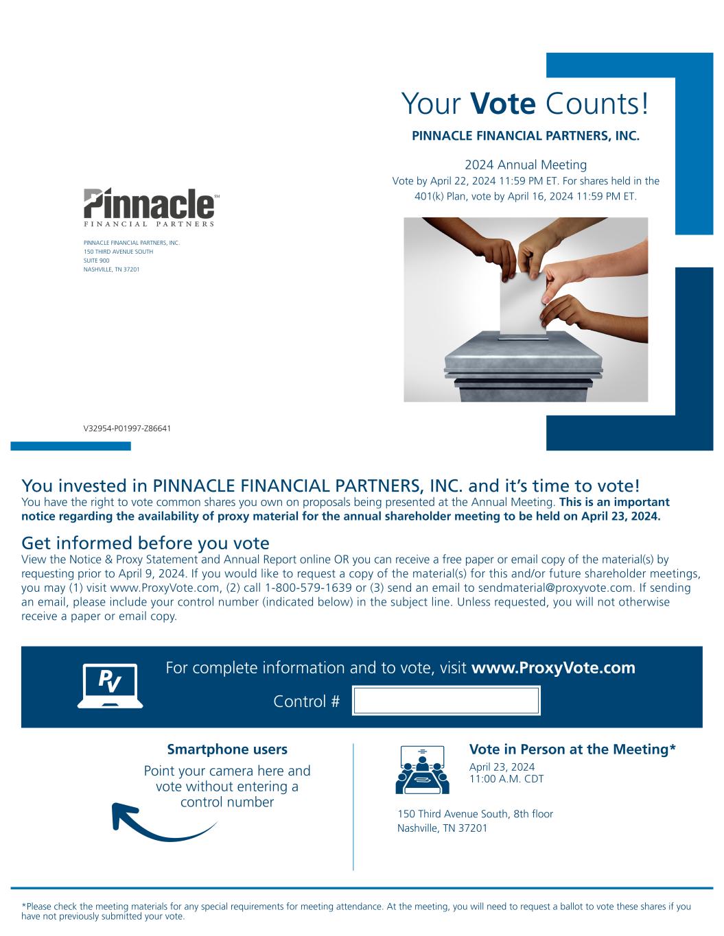 Your Vote Counts! PINNACLE FINANCIAL PARTNERS, INC. You invested in PINNACLE FINANCIAL PARTNERS, INC. and it’s time to vote! You have the right to vote common shares you own on proposals being presented at the Annual Meeting. This is an important notice regarding the availability of proxy material for the annual shareholder meeting to be held on April 23, 2024. Get informed before you vote View the Notice & Proxy Statement and Annual Report online OR you can receive a free paper or email copy of the material(s) by requesting prior to April 9, 2024. If you would like to request a copy of the material(s) for this and/or future shareholder meetings, you may (1) visit www.ProxyVote.com, (2) call 1-800-579-1639 or (3) send an email to sendmaterial@proxyvote.com. If sending an email, please include your control number (indicated below) in the subject line. Unless requested, you will not otherwise receive a paper or email copy. Vote in Person at the Meeting* April 23, 2024 11:00 A.M. CDT 150 Third Avenue South, 8th floor Nashville, TN 37201 *Please check the meeting materials for any special requirements for meeting attendance. At the meeting, you will need to request a ballot to vote these shares if you have not previously submitted your vote. Smartphone users Point your camera here and vote without entering a control number For complete information and to vote, visit www.ProxyVote.com Control # V32954-P01997-Z86641 PINNACLE FINANCIAL PARTNERS, INC. 150 THIRD AVENUE SOUTH SUITE 900 NASHVILLE, TN 37201 2024 Annual Meeting Vote by April 22, 2024 11:59 PM ET. For shares held in the 401(k) Plan, vote by April 16, 2024 11:59 PM ET.