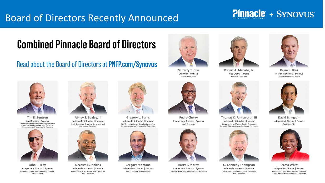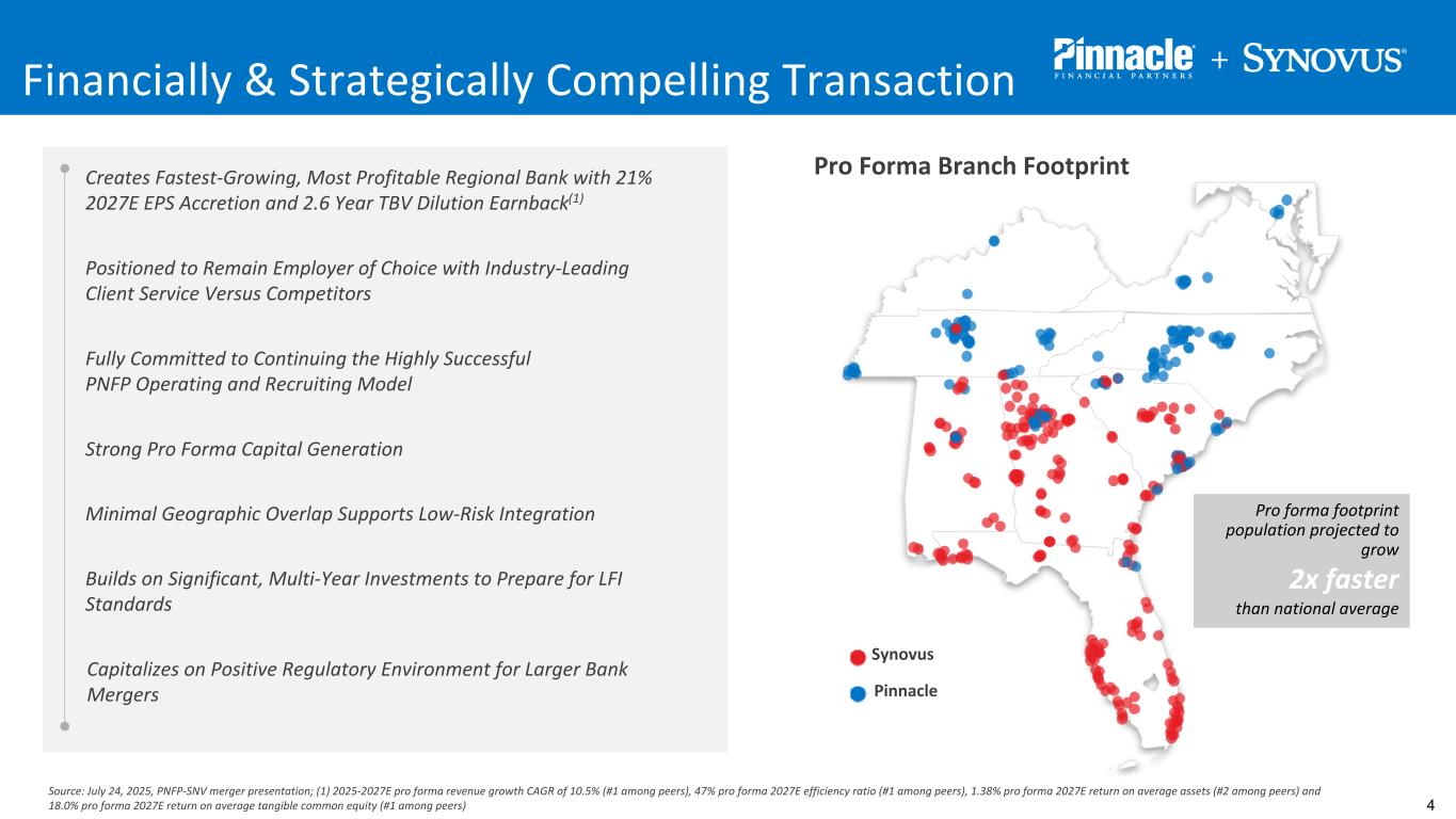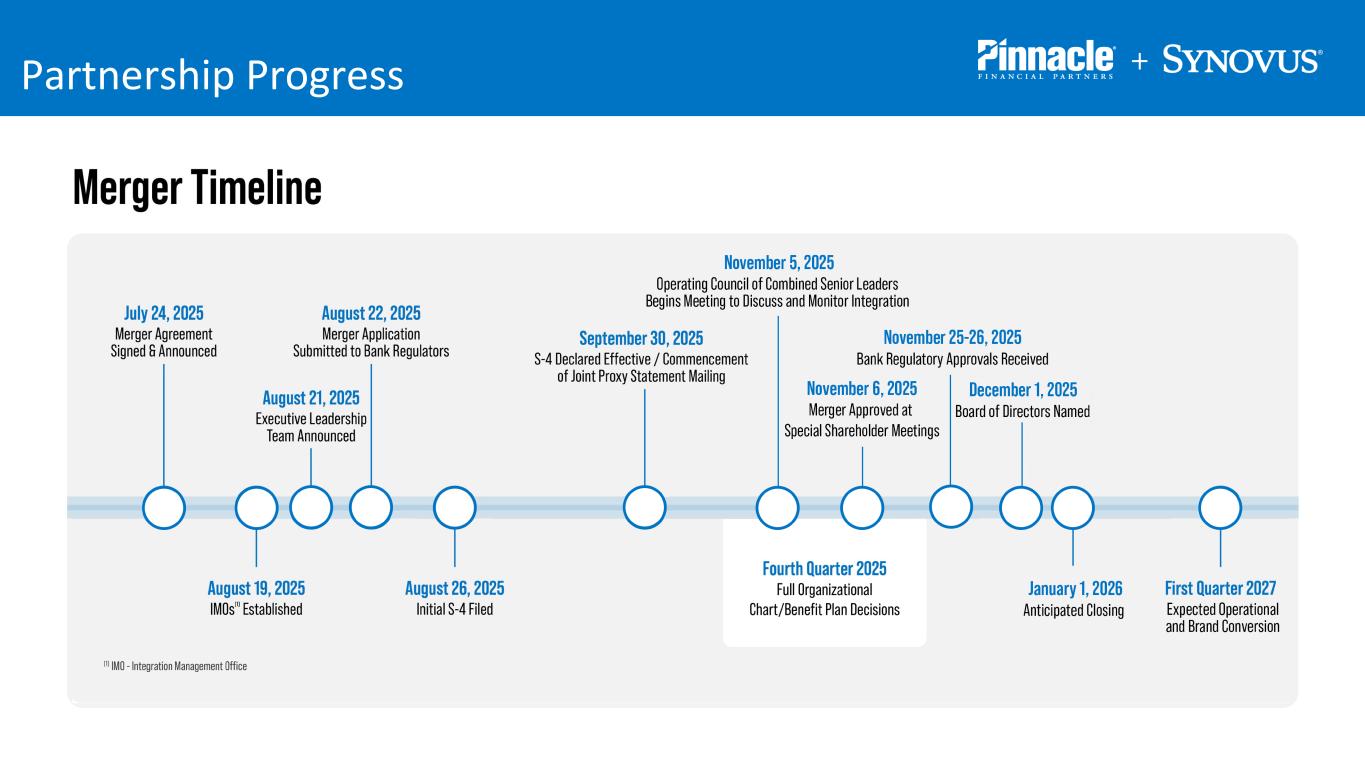 2 This communication contains statements that constitute “forward-looking statements” within the meaning of, and subject to the protections of, Section 27A of the Securities Act of 1933, as amended, and Section 21E of the Securities Exchange Act of 1934, as amended. All statements other than statements of historical fact are forward-looking statements. These forward-looking statements include, but are not limited to, statements about the benefits of the proposed transaction between Synovus Financial Corp. (“Synovus”) and Pinnacle Financial Partners, Inc. (“Pinnacle”), including future financial and operating results (including the anticipated impact of the proposed transaction on Synovus’ and Pinnacle’s respective earnings and tangible book value), statements related to the expected timing of the completion of the proposed transaction, the combined company’s plans, objectives, expectations and intentions, and other statements that are not historical facts. You can identify these forward-looking statements through the use of words such as “believes,” “anticipates,” “expects,” “may,” “will,” “assumes,” “should,” “predicts,” “could,” “would,” “intends,” “targets,” “estimates,” “projects,” “plans,” “potential” and other similar words and expressions of the future or otherwise regarding the outlook for Synovus’, Pinnacle’s or combined company’s future businesses and financial performance and/or the performance of the banking industry and economy in general. Prospective investors are cautioned that any such forward-looking statements are not guarantees of future performance and involve known and unknown risks and uncertainties which may cause the actual results, performance or achievements of Synovus, Pinnacle or the combined company to be materially different from the future results, performance or achievements expressed or implied by such forward-looking statements. Forward-looking statements are based on the information known to, and current beliefs and expectations of, Synovus or Pinnacle and are subject to significant risks and uncertainties. Actual results may differ materially from those contemplated by such forward-looking statements. A number of factors could cause actual results to differ materially from those contemplated by the forward-looking statements in this communication. Many of these factors are beyond Synovus’, Pinnacle’s or the combined company’s ability to control or predict. These factors include, among others, (1) the risk that the cost savings and synergies from the proposed transaction may not be fully realized or may take longer than anticipated to be realized, (2) disruption to Synovus’ business and to Pinnacle’s business as a result of the announcement and pendency of the proposed transaction, (3) the risk that the integration of Pinnacle’s and Synovus’ respective businesses and operations will be materially delayed or will be more costly or difficult than expected, including as a result of unexpected factors or events, (4) the failure to obtain the necessary approvals by the shareholders of Synovus or Pinnacle, (5) the amount of the costs, fees, expenses and charges related to the transaction, (6) the ability by each of Synovus and Pinnacle to obtain required governmental approvals of the proposed transaction on the timeline expected, or at all, and the risk that such approvals may result in the imposition of conditions that could adversely affect the combined company after the closing of the proposed transaction or adversely affect the expected benefits of the proposed transaction, (7) reputational risk and the reaction of each company’s customers, suppliers, employees or other business partners to the proposed transaction, (8) the failure of the closing conditions in the merger agreement to be satisfied, or any unexpected delay in closing the proposed transaction or the occurrence of any event, change or other circumstances that could give rise to the termination of the merger agreement, (9) the dilution caused by the issuance of shares of the combined company’s common stock in the transaction, (10) the possibility that the proposed transaction may be more expensive to complete than anticipated, including as a result of unexpected factors or events, (11) risks related to management and oversight of the expanded business and operations of the combined company following the closing of the proposed transaction, (12) the possibility the combined company is subject to additional regulatory requirements as a result of the proposed transaction or expansion of the combined company’s business operations following the proposed transaction, (13) the outcome of any legal or regulatory proceedings or governmental inquiries or investigations that may be currently pending or later instituted against Synovus, Pinnacle or the combined company and (14) general competitive, economic, political and market conditions and other factors that may affect future results of Synovus and Pinnacle including changes in asset quality and credit risk; the inability to sustain revenue and earnings growth; changes in interest rates and capital markets; inflation; customer borrowing, repayment, investment and deposit practices; the impact, extent and timing of technological changes; and capital management activities. Additional factors which could affect future results of Synovus and Pinnacle can be found in Synovus’ or Pinnacle’s filings with the Securities and Exchange Commission (the “SEC”), including in Synovus’ Annual Report on Form 10-K for the year ended December 31, 2024, under the captions “Forward-Looking Statements” and “Risk Factors,” and Synovus’ Quarterly Reports on Form 10-Q and Current Reports on Form 8-K, and Pinnacle’s Annual Report on Form 10-K for the year ended December 31, 2024, under the captions “Forward-Looking Statements” and “Risk Factor