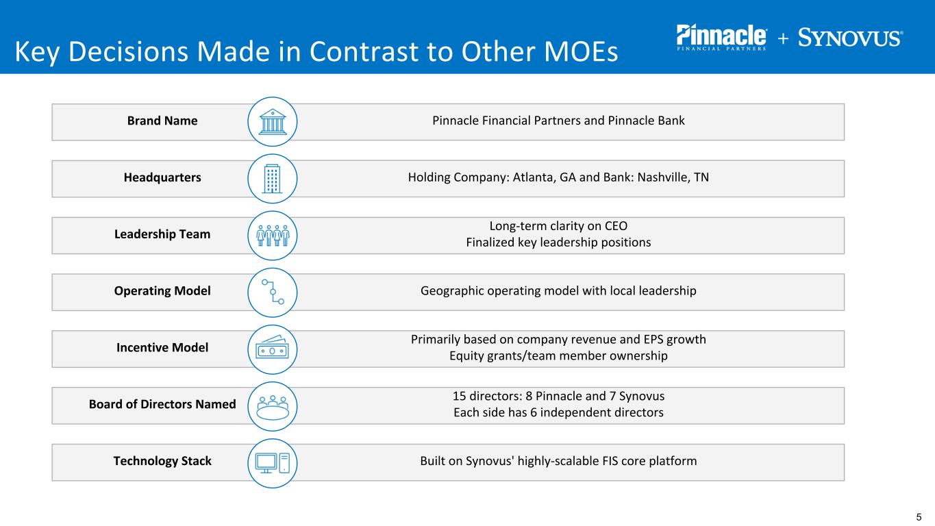 4 Pro Forma Branch Footprint Synovus Pro forma footprint population projected to grow 2x faster than national average Source: July 24, 2025, PNFP-SNV merger presentation; (1) 2025-2027E pro forma revenue growth CAGR of 10.5% (#1 among peers), 47% pro forma 2027E efficiency ratio (#1 among peers), 1.38% pro forma 2027E return on average assets (#2 among peers) and 18.0% pro forma 2027E return on average tangible common equity (#1 among peers) Fully Committed to Continuing the Highly Successful PNFP Operating and Recruiting Model Positioned to Remain Employer of Choice with Industry-Leading Client Service Versus Competitors Strong Pro Forma Capital Generation Minimal Geographic Overlap Supports Low-Risk Integration Builds on Significant, Multi-Year Investments to Prepare for LFI Standards Capitalizes on Positive Regulatory Environment for Larger Bank Mergers Creates Fastest-Growing, Most Profitable Regional Bank with 21% 2027E EPS Accretion and 2.6 Year TBV Dilution Earnback(1) Pinnacle Financially & Strategically Compelling Transaction