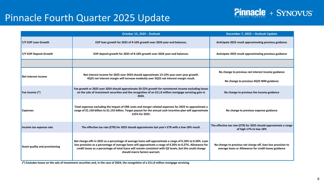 6 Pinnacle Fourth Quarter 2025 Update October 15, 2025 - Outlook December 7, 2025 – Outlook Update Y/Y EOP Loan Growth EOP loan growth for 2025 of 9-10% growth over 2024 year-end balances. Anticipate 2025 result approximating previous guidance Y/Y EOP Deposit Growth EOP deposit growth for 2025 of 8-10% growth over 2024 year-end balances. Anticipate 2025 result approximating previous guidance Net interest income Net interest income for 2025 over 2024 should approximate 13-14% year-over-year growth. 4Q25 net interest margin will increase modestly over 3Q25 net interest margin result. No change to previous net interest income guidance No change to previous 4Q25 NIM guidance Fee income (*) Fee growth or 2025 over 2024 should approximate 20-22% growth for noninterest income excluding losses on the sale of investment securities and the recognition of an $11.8 million mortgage servicing gain in 2024. No change to previous fee income guidance Expenses Total expenses excluding the impact of ORE costs and merger-related expenses for 2025 to approximate a range of $1.150 billion to $1.155 billion. Target payout for the annual cash incentive plan will approximate 125% for 2025. No change to previous expense guidance Income tax expense rate The effective tax rate (ETR) for 2025 should approximate last year's ETR with a low-18% result. The effective tax rate (ETR) for 2025 should approximate a range of high-17% to low-18% Asset quality and provisioning Net charge-offs in 2025 as a percentage of average loans will approximate a range of 0.18% to 0.20%. Loan loss provision as a percentage of average loans will approximate a range of 0.26% to 0.27%. Allowance for credit losses as a percentage of total loans will remain consistent with Q3 levels, but this could change should macro factors warrant. No change to previous net charge off, loan loss provision to average loans or Allowance for credit losses guidance (*) Excludes losses on the sale of investment securities and, in the case of 2024, the recognition of a $11.8 million mortgage servicing.