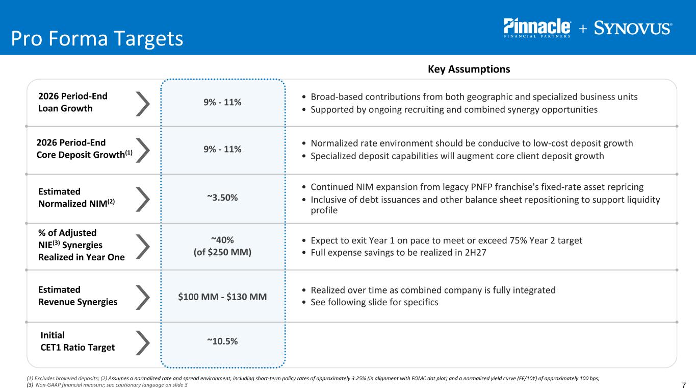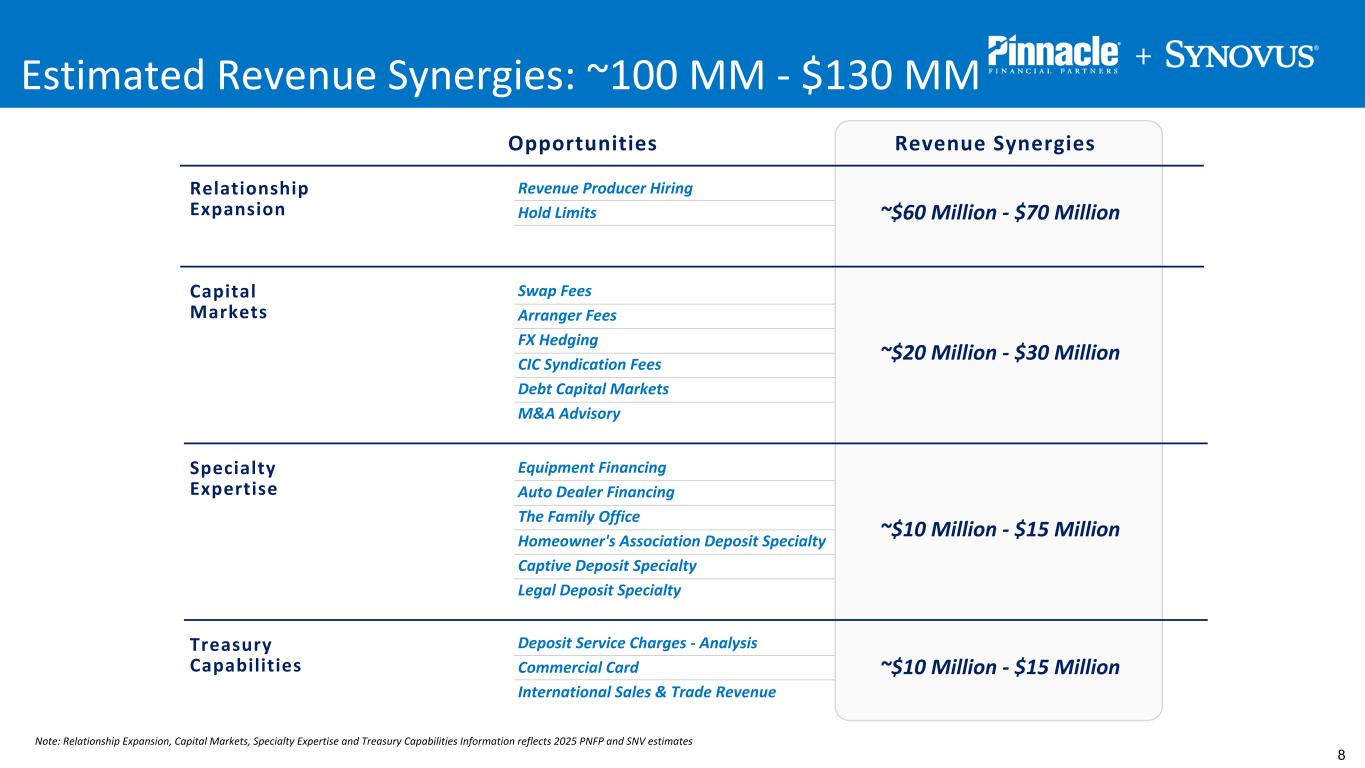 7 Key Assumptions 2026 Period-End Loan Growth 2026 Period-End Core Deposit Growth(1) Estimated Normalized NIM(2) % of Adjusted NIE(3) Synergies Realized in Year One Initial CET1 Ratio Target Estimated Revenue Synergies • Normalized rate environment should be conducive to low-cost deposit growth • Specialized deposit capabilities will augment core client deposit growth • Continued NIM expansion from legacy PNFP franchise's fixed-rate asset repricing • Inclusive of debt issuances and other balance sheet repositioning to support liquidity profile • Expect to exit Year 1 on pace to meet or exceed 75% Year 2 target • Full expense savings to be realized in 2H27 ~3.50% ~40% (of $250 MM) $100 MM - $130 MM ~10.5% 9% - 11% 9% - 11% • Broad-based contributions from both geographic and specialized business units • Supported by ongoing recruiting and combined synergy opportunities Pro Forma Targets • Realized over time as combined company is fully integrated • See following slide for specifics (1) Excludes brokered deposits; (2) Assumes a normalized rate and spread environment, including short-term policy rates of approximately 3.25% (in alignment with FOMC dot plot) and a normalized yield curve (FF/10Y) of approximately 100 bps; (3) Non-GAAP financial measure; see cautionary language on slide 3