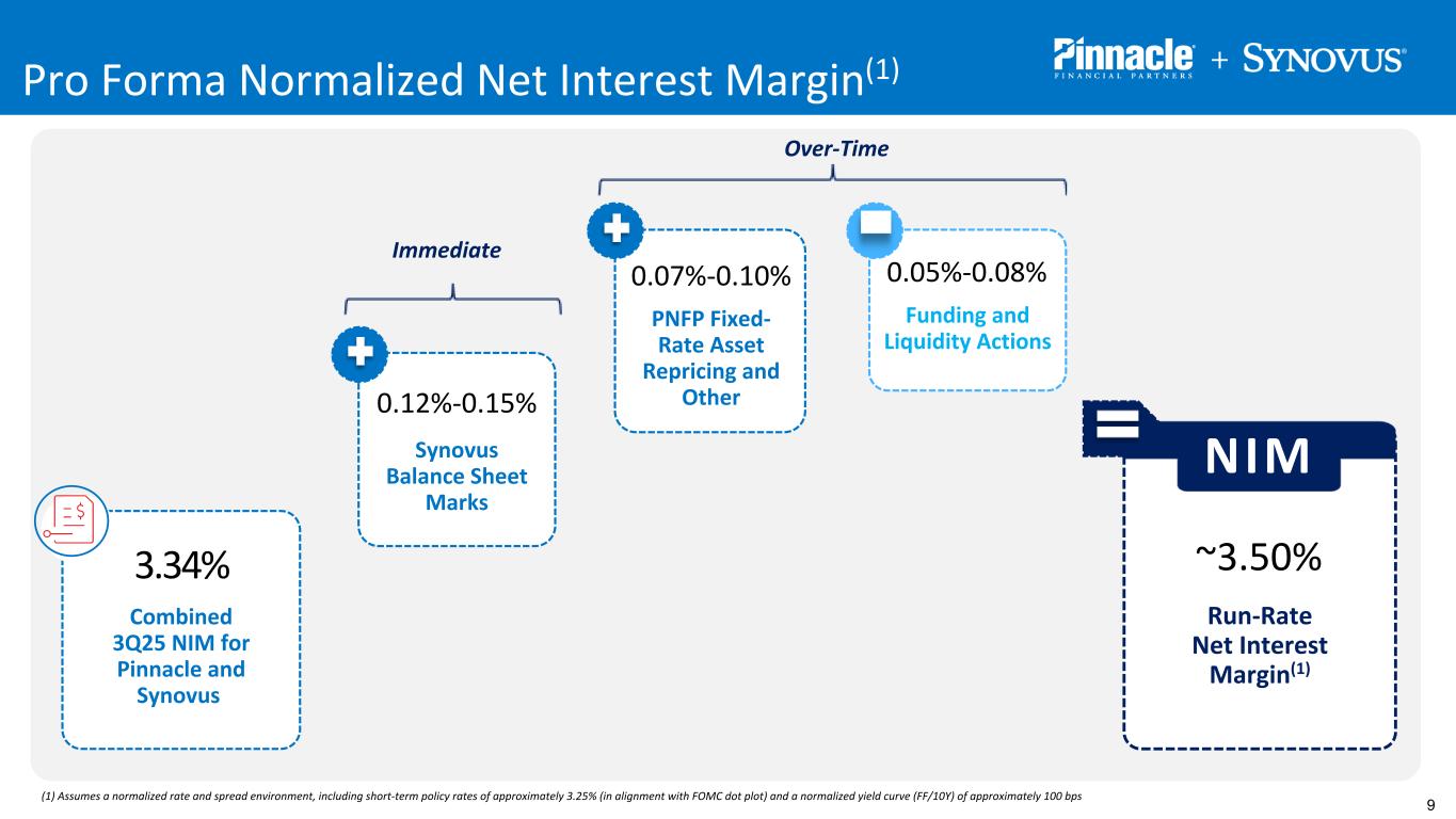 8 Relationship Expansion Capital Markets Specialty Expertise Treasury Capabilities Opportunities Revenue Synergies Estimated Revenue Synergies: ~100 MM - $130 MM Revenue Producer Hiring ~$60 Million - $70 MillionHold Limits Swap Fees ~$20 Million - $30 Million Arranger Fees FX Hedging CIC Syndication Fees Debt Capital Markets M&A Advisory Equipment Financing ~$10 Million - $15 Million Auto Dealer Financing The Family Office Homeowner's Association Deposit Specialty Captive Deposit Specialty Legal Deposit Specialty Deposit Service Charges - Analysis ~$10 Million - $15 MillionCommercial Card International Sales & Trade Revenue Note: Relationship Expansion, Capital Markets, Specialty Expertise and Treasury Capabilities Information reflects 2025 PNFP and SNV estimates