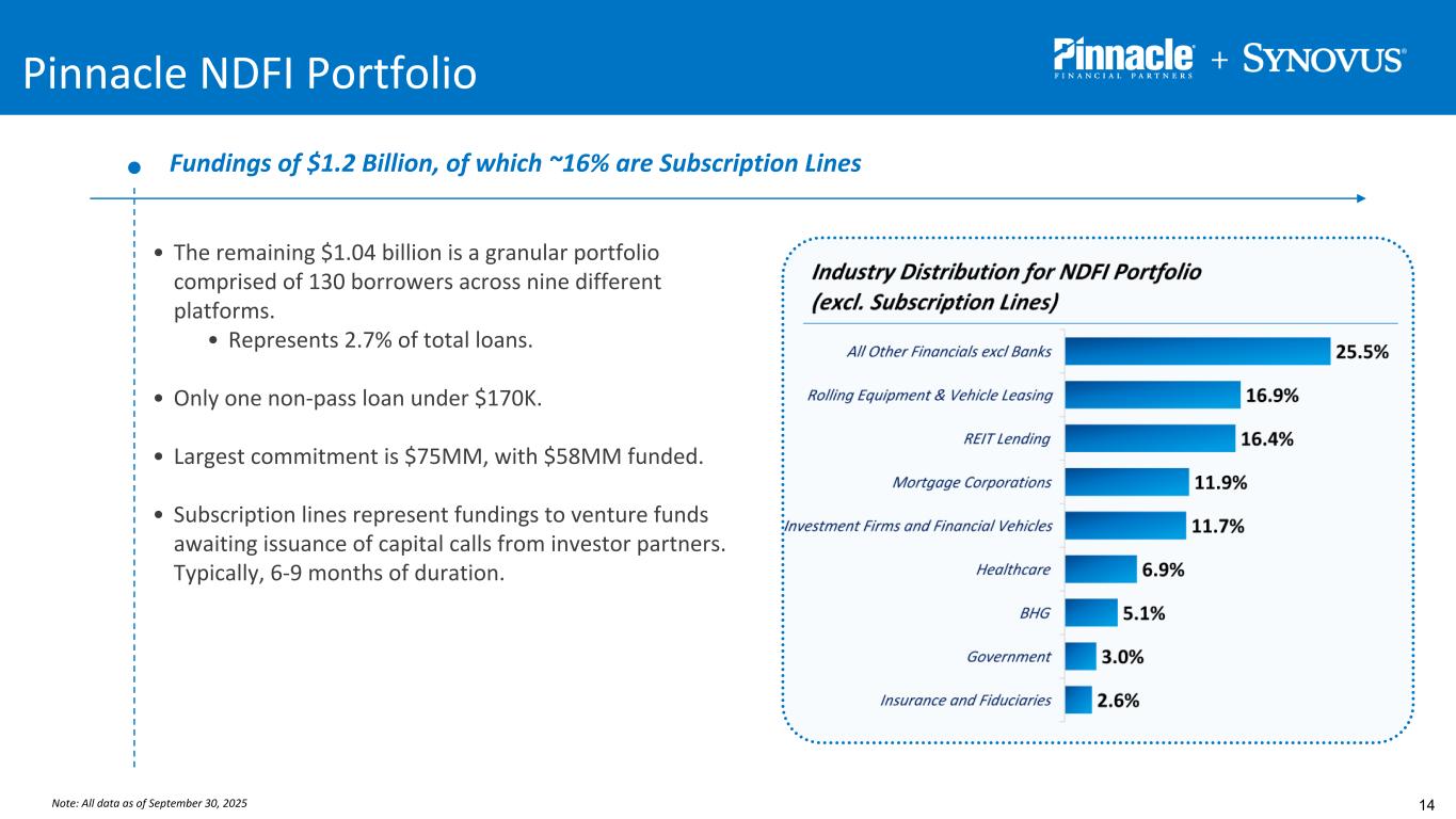 14 Fundings of $1.2 Billion, of which ~16% are Subscription Lines • The remaining $1.04 billion is a granular portfolio comprised of 130 borrowers across nine different platforms. • Represents 2.7% of total loans. • Only one non-pass loan under $170K. • Largest commitment is $75MM, with $58MM funded. • Subscription lines represent fundings to venture funds awaiting issuance of capital calls from investor partners. Typically, 6-9 months of duration. Pinnacle NDFI Portfolio Note: All data as of September 30, 2025