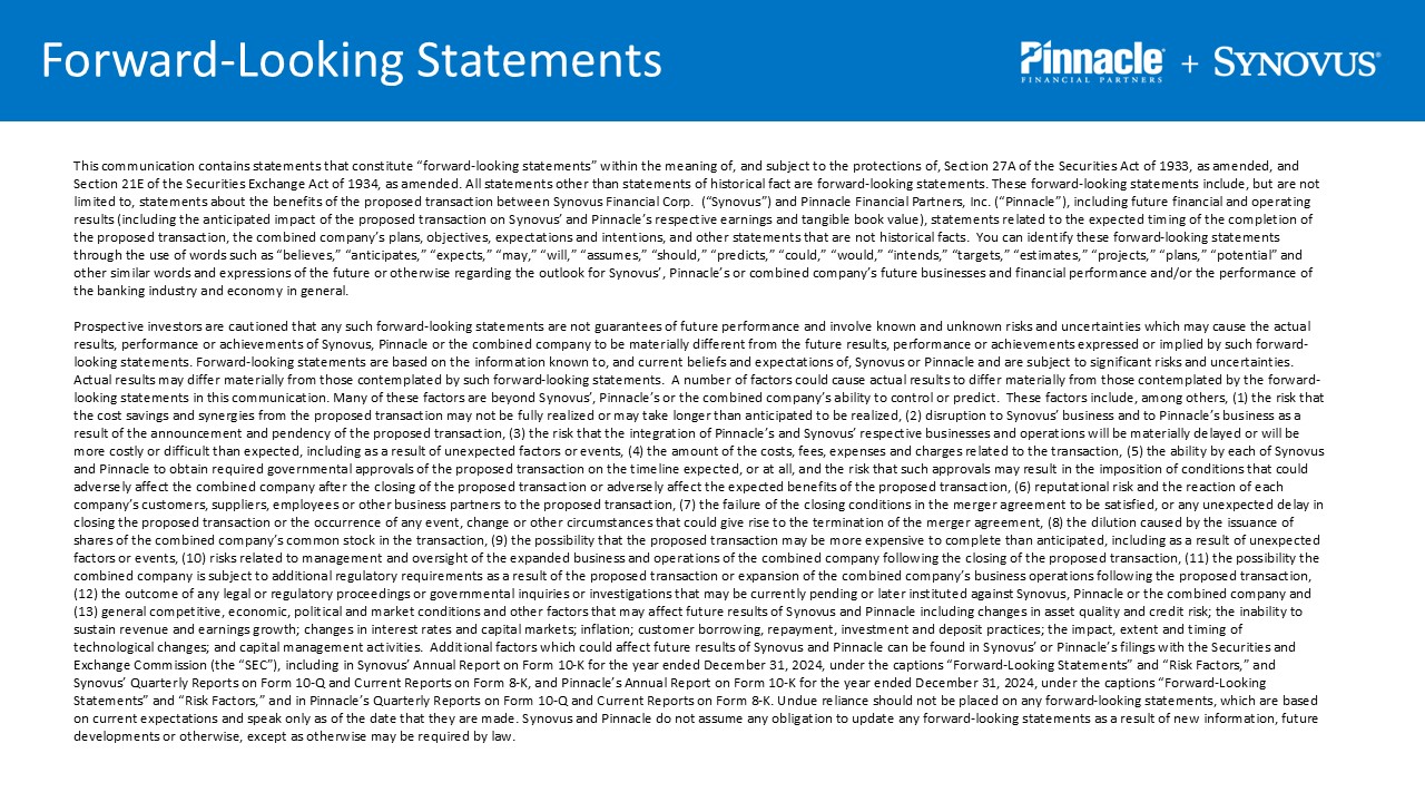 statements of historical fact are forward-looking statements. These forward-looking statements include, but are not limited to, statements about the benefits of the proposed transaction between Synovus Financial Corp. (“Synovus”) and Pinnacle