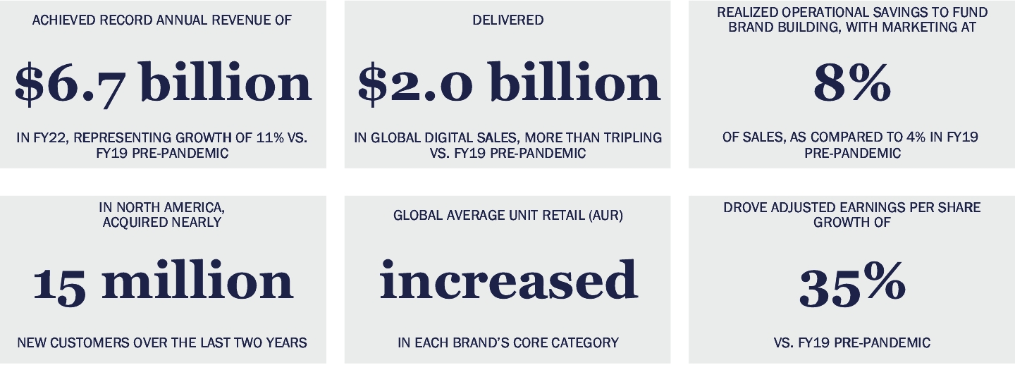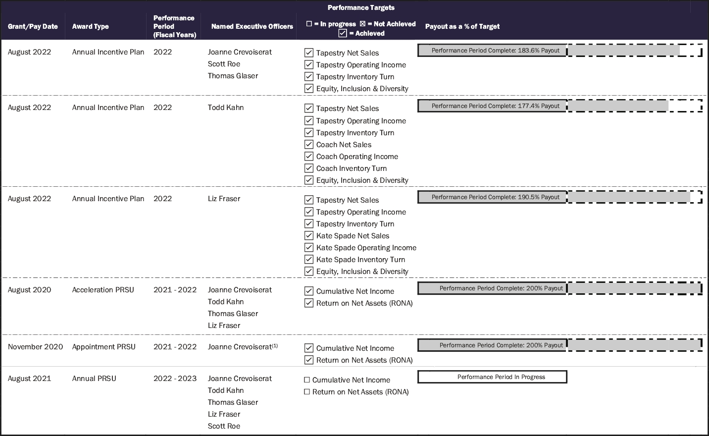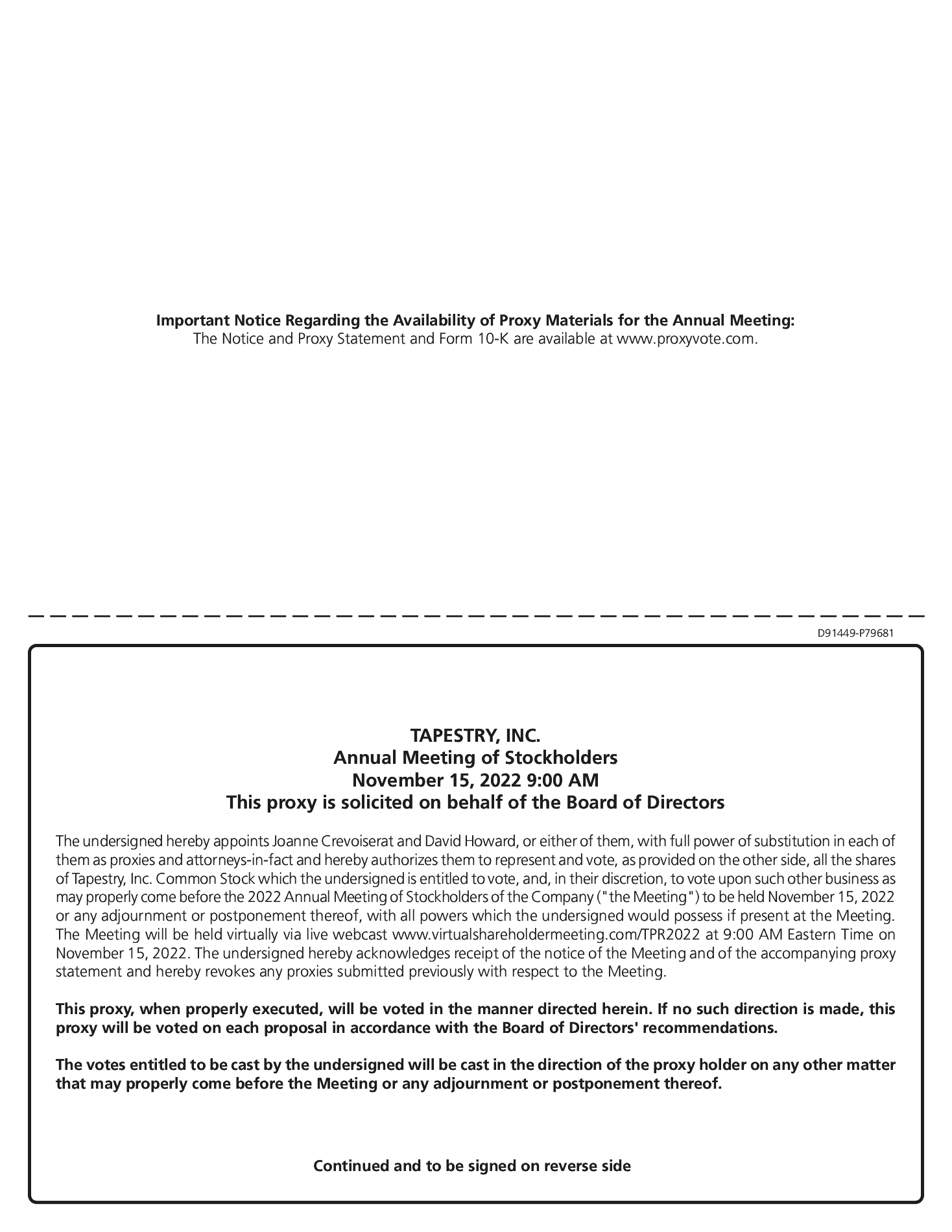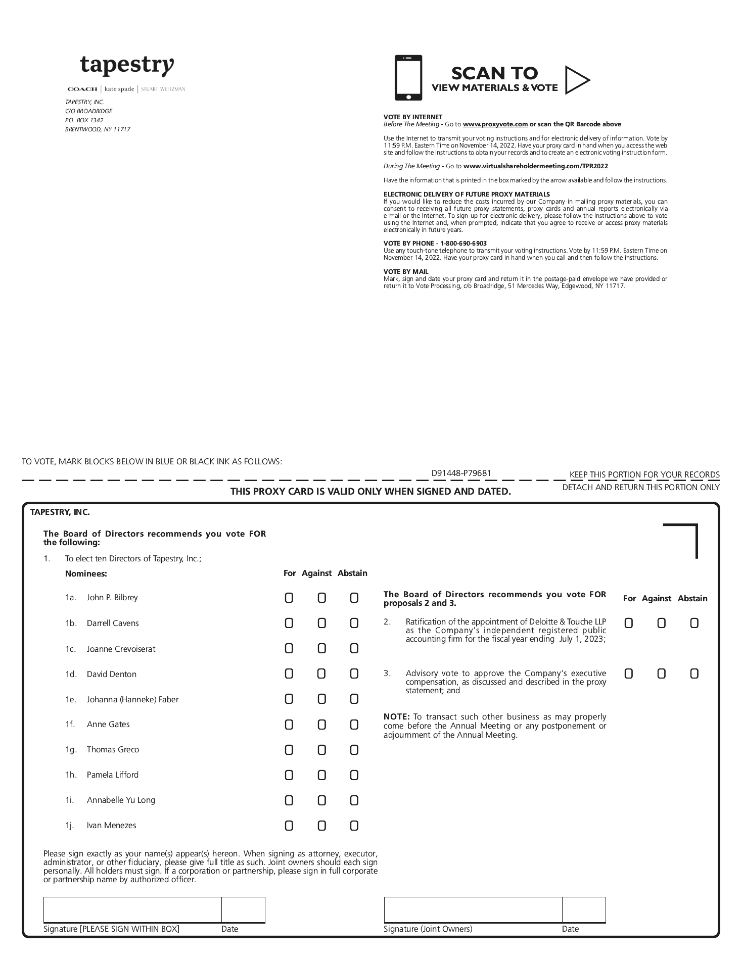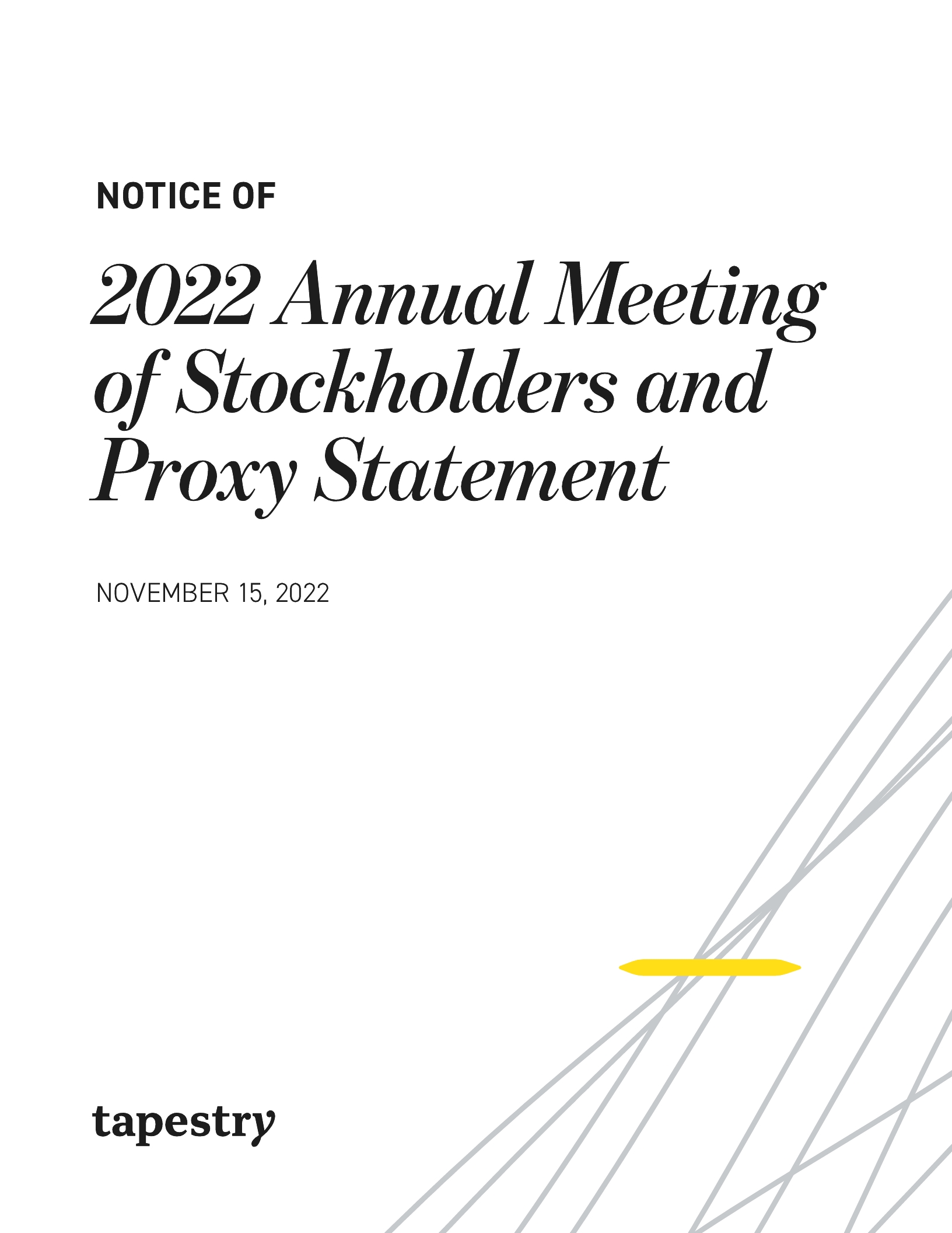 (18) Includes 59,854 shares of common stock that may be acquired within 60 days of August 31, 2022 pursuant to the exercise of options and 9,107 stock equivalents held under the Tapestry, Inc. Non-Qualified Deferred Compensation Plan for Independent Directors and the Company's stock incentive plans and includes 26,937 shares held indirectly through an irrevocable trust of which his spouse is the trustee.