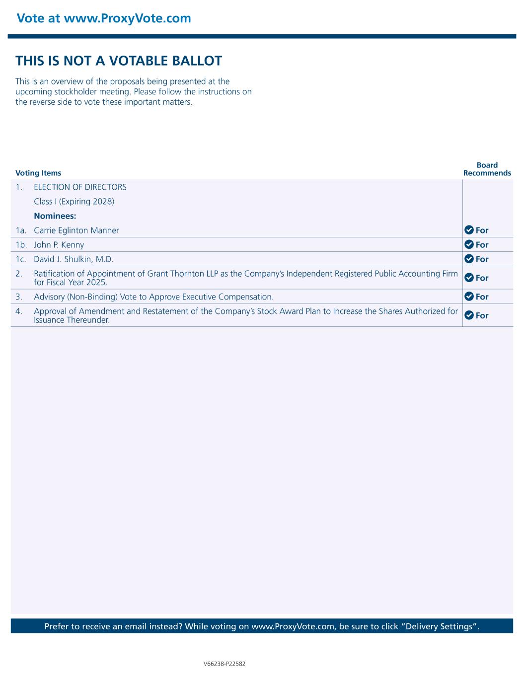 THIS IS NOT A VOTABLE BALLOT This is an overview of the proposals being presented at the upcoming stockholder meeting. Please follow the instructions on the reverse side to vote these important matters. Vote at www.ProxyVote.com Prefer to receive an email instead? While voting on www.ProxyVote.com, be sure to click “Delivery Settings”. Voting Items Board Recommends V66238-P22582 1. ELECTION OF DIRECTORS Class I (Expiring 2028) Nominees: 1a. Carrie Eglinton Manner For 1b. John P. Kenny For 1c. David J. Shulkin, M.D. For 2. Ratification of Appointment of Grant Thornton LLP as the Company’s Independent Registered Public Accounting Firm for Fiscal Year 2025. For 3. Advisory (Non-Binding) Vote to Approve Executive Compensation. For 4. Approval of Amendment and Restatement of the Company’s Stock Award Plan to Increase the Shares Authorized for Issuance Thereunder. For