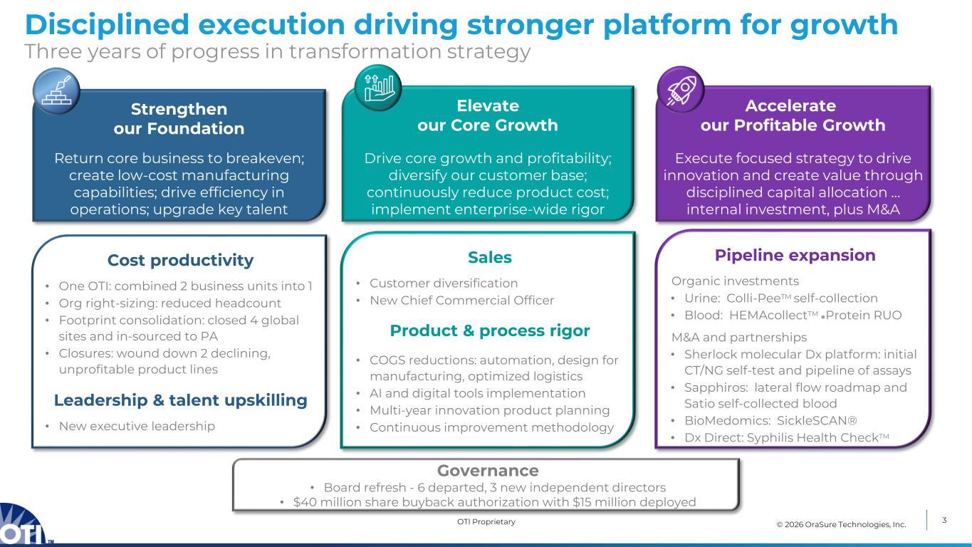 © 2026 OraSure Technologies, Inc. 2OTI Proprietary Disclaimers Forward-Looking Statements: This presentation of OraSure Technologies, Inc. (the “Company” or “OraSure”) contains certain “forward-looking statements” within the meaning of federal securities laws, including with respect to products, product candidate development and manufacturing activities, regulatory submissions and authorizations, revenue growth and guidance, expected revenue from government orders, cost savings, cash flow, increasing margins and other matters. Forward-looking statements are not guarantees of future performance or results. Known and unknown factors that could cause actual performance or results to be materially different from those expressed or implied in these statements include, but are not limited to: OraSure’s ability to satisfy customer demand; ability to reduce OraSure’s spending rate, capitalize on manufacturing efficiencies and drive profitable growth; ability to market and sell products, whether through the Company’s internal, direct sales force or third parties; failure of distributors or other customers to meet purchase forecasts, historic purchase levels or minimum purchase requirements for our products; ability to manufacture products in accordance with applicable specifications, performance standards and quality requirements; ability to obtain, and timing and cost of obtaining, necessary regulatory approvals for new products or new indications or applications for existing products; ability to comply with applicable regulatory requirements; ability to effectively resolve warning letters, audit observations and other findings or comments from the FDA or other regulators; changes in relationships, including disputes or disagreements, with strategic partners or other parties and reliance on strategic partners for the performance of critical activities under collaborative arrangements; impact of replacing distributors; inventory levels at distributors and other customers; OraSure’s ability to achieve its financial and strategic objectives and increase its revenues, including the ability to expand international sales; ability to achieve the anticipated benefits from the BioMedomics transaction; impact of competitors, competing products and technology changes; reduction or deferral of public funding available to customers; competition from new or better technology or lower cost products; ability to develop, commercialize and market new products; changes in market acceptance of products based on product performance or other factors, including changes in testing guidelines, algorithms or other recommendations by the Centers for Disease Control and Prevention or other agencies; ability to fund research and development and other products and operations; ability to obtain and maintain new or existing product distribution channels; reliance on sole supply sources for critical products and components; availability of related products produced by third parties or products required for use of the Company’s products; impact of contracting with the U.S. government; impact of negative economic conditions; ability to achieve and maintain sustained profitability; ability to increase OraSure’s gross margins; ability to utilize net operating loss carry forwards or other deferred tax assets; uncertainty relating to patent protection and potential patent infringement claims; uncertainty and costs of litigation relating to patents, trade secrets and other intellectual property; availability of licenses to patents or other technology; ability to enter into international manufacturing agreements; obstacles to international marketing and manufacturing of products; impact of changes in international funding sources and testing algorithms on international sales; adverse movements in foreign currency exchange rates; loss or impairment of sources of capital; ability to attract and retain qualified personnel; exposure to product liability and other types of litigation; changes in international, federal or state laws and regulations; customer consolidations and inventory practices; equipment failures and ability to obtain needed raw materials and components; the impact of cybersecurity incidents and other disruptions involving the Company’s computer systems or those of our third-party IT service providers, suppliers and customers; the impact of terrorist attacks, civil unrest, hostilities and war; and general political, business and economic conditions, including interest rates, inflationary pressures, capital market disruptions, changes in governmental agencies, international tariffs, trade protection measures, economic sanctions and economic slowdowns or recession. These and other factors that could affect the Company’s results are discussed more fully in OraSure’s filings with the Securities and Exchange Commission (the “SEC”), including the Company’s registration statements, Annual Report on Form 10-K for the year ended December 31, 2024, Quarterly Reports on Form 10-Q, and other filings with the SEC. Although forward-looking statements help to provide information about future prospects, readers should keep in mind that forward-looking statements may not be reliable. Readers are cautioned not to place undue reliance on the forward-looking statements. The forward-looking statements are made as of the date of this presentation and OraSure undertakes no duty to update these statements. Estimates and Other Data: This presentation contains estimates and other data made by independent parties and the Company relating to market size and growth and other data about its industry. Such data involves a number of assumptions and limitations, and you are cautioned not to give undue weight to such estimates. In addition, projections, assumptions and estimates of the Company’s future performance and the future performance of the markets in which it operates are necessarily subject to a high degree 