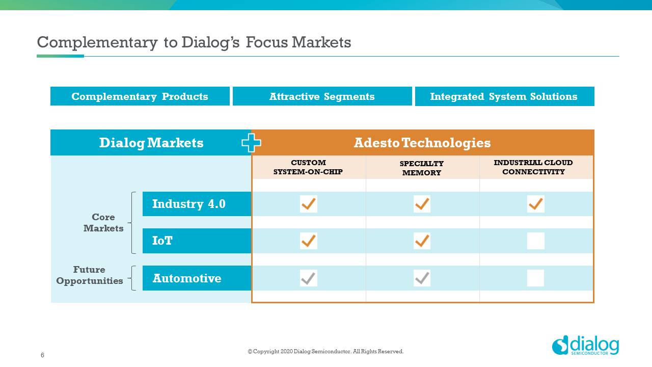buildings and industrial automation systems, adding further capabilities to the portfolio from the acquisition of Creative Chips. Let’s move on to Slide 6 to further discuss why Adesto is the right fit for Dialog.