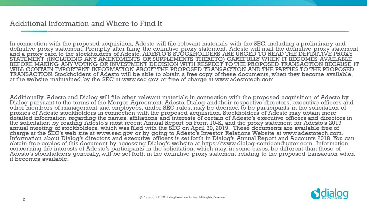 the SEC’s web site at www.sec.gov or by going to Adesto’s Investor Relations Website at www.adestotech.com. Information about Dialog’s directors and executive officers is set forth in Dialog’s Annual Report and Accounts 2018. You can obtain free